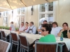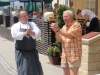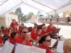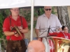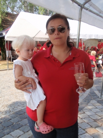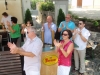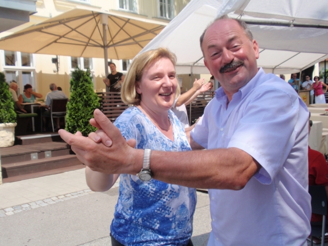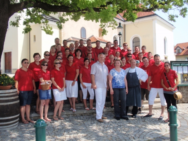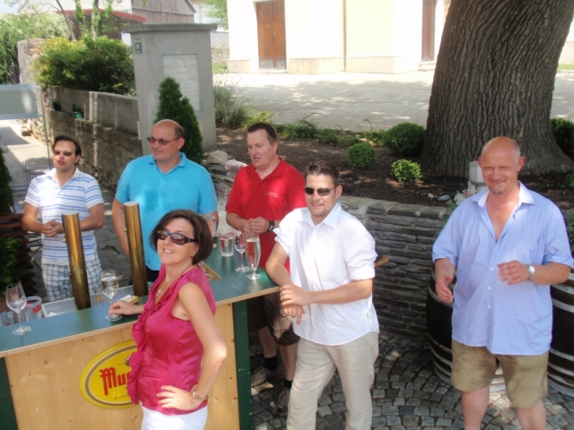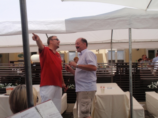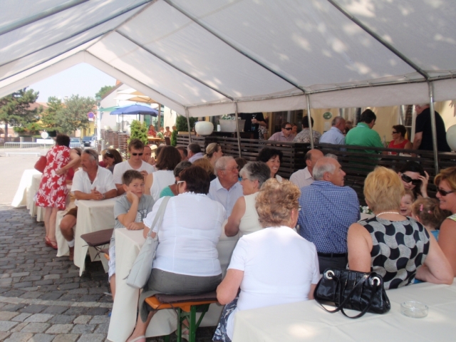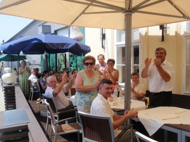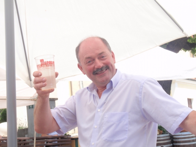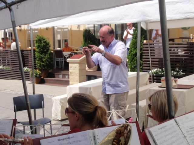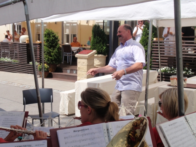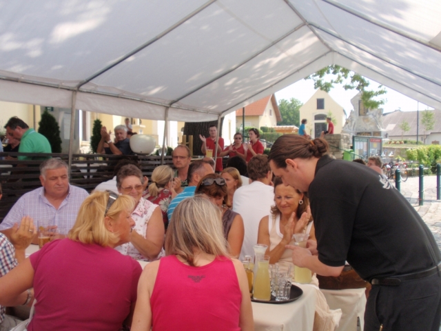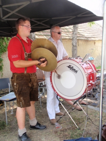Dabei spielte man vor dem Lokal in einem kleinen Zelt. Das Vinarium Bittermann sorgte für Speis und Trank. Weiters konnte sich Adi und sein Team über eine voll besetzte Terrasse freuen. Bei Stücken wie "Böhmischer Traum", "Dem Lande Tirol die Treue", "Göttlesbrunner Musikantenmarsch" herrschte eine tolle Stimmung und es tanzten zahlreiche Gäste auf den Sesseln und Tischen. Weiters musste der Präsident des neu gegründeten Fan-Clubs Ing. Franz Netzl, welcher bei einer Geburtstagsfeier bereits gute Ansätze als Stabführer zeigte, einen Marsch dirigieren, was ohne Probleme gemeistert wurde. Da zu dieser Zeit auch ein Mangel an Schlagzeugern herrschte, musste unser Bürgermeister Ing. Franz Glock auf der großen Trommel aushelfen, was ebenfalls hervorragend gemeistert wurde. Weiters wurde mit unserem "Schakl" ADAM`s feine Kost ein neuer Thenorhornspieler entdeckt. Dieser musste gleich bei der derzeit stimmungsvollsten Polka "Böhmischer Traum" sein Können unter Beweis stellen. Abschließend musste noch der Gastgeber Adi Bittermann den Dirigentenstab bzw den Kochlöffel schwingen und der Kapelle den Takt vorgeben. Die Gastgeberin Bettina Bittermann musste dazu eifrig tanzen. Wie man wieder gemerkt hat, ist so ein Frühschoppen immer wieder eine tolle Sache, da immer wieder neue Musiktalente entdeckt werden. |