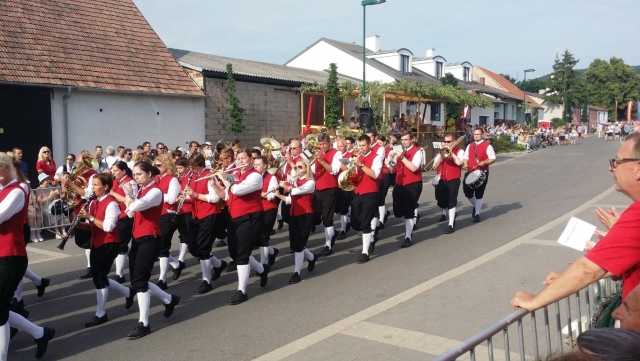 Ab 15 Uhr marschierten die 27 teilnehmenden Kapellen bei tropischen Temperaturen nacheinander ein. Ab 15.30 Uhr folgten die Begrüßungsworte und das Gemeinschaftskonzert, wobei von den ca 900 Musikanten die Musikstücke „Musica Solemnis“, „Heimat am Leithaberge Marsch“, „Oh Du mein Österreich“ und die „NÖ-Landeshymne“ zum Besten gegeben wurden. Danach startete ab 16 Uhr die Marschmusikbewertung, wobei 14 Kapellen in der höchsten Stufe „E“, 12 Kapellen in der Stufe „D“ und eine Kapelle in der Stufe A antraten. Unter der strengen Aufsicht des Bewerterteams Franz Herzog, Kapellmeister der Polizeimusik NÖ, Anton Pistotnig, ehemaliger und langjähriger Kapellmeister der Mil.Kapelle NÖ, sowie Günter Weiss, Bezirkskapellmeister in der BAG Krems wurden alle teilnehmenden Vereine bewertet.
