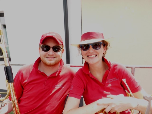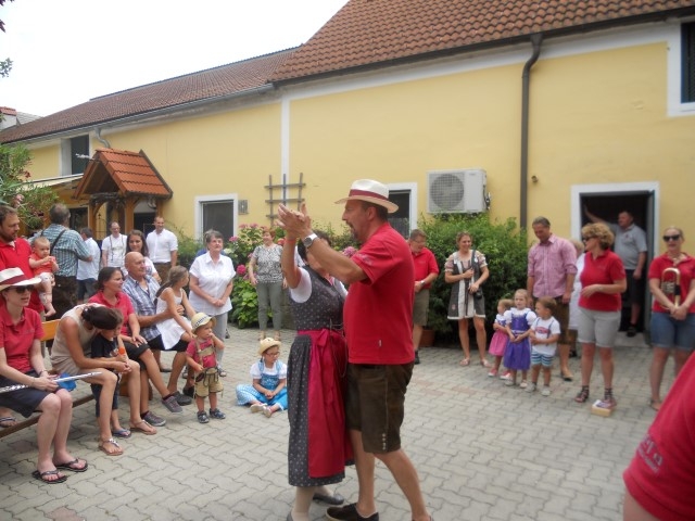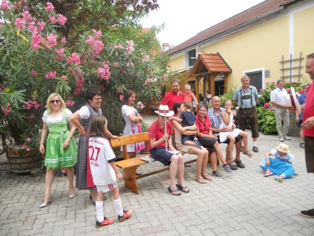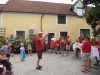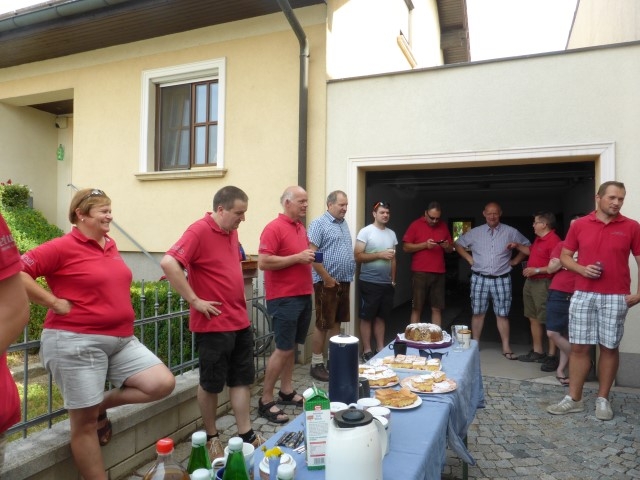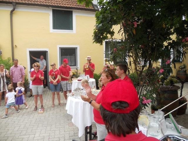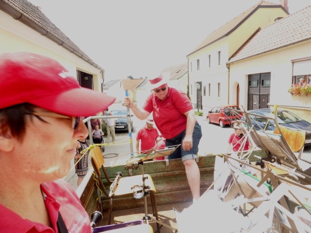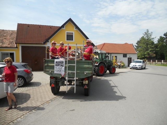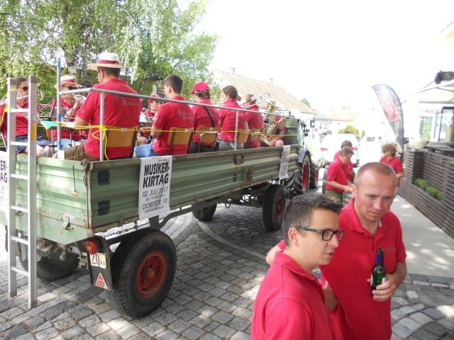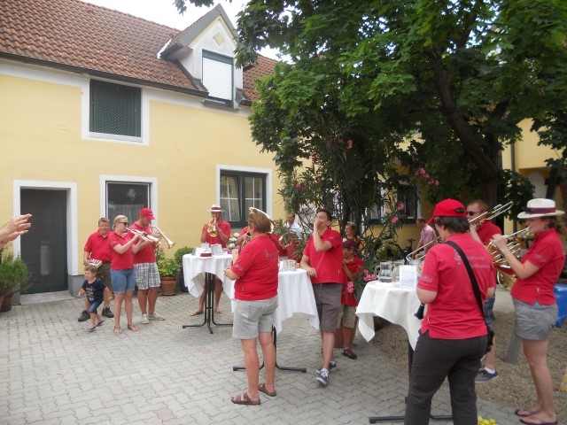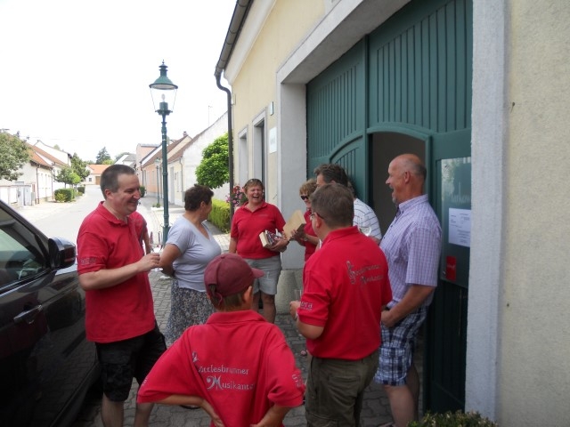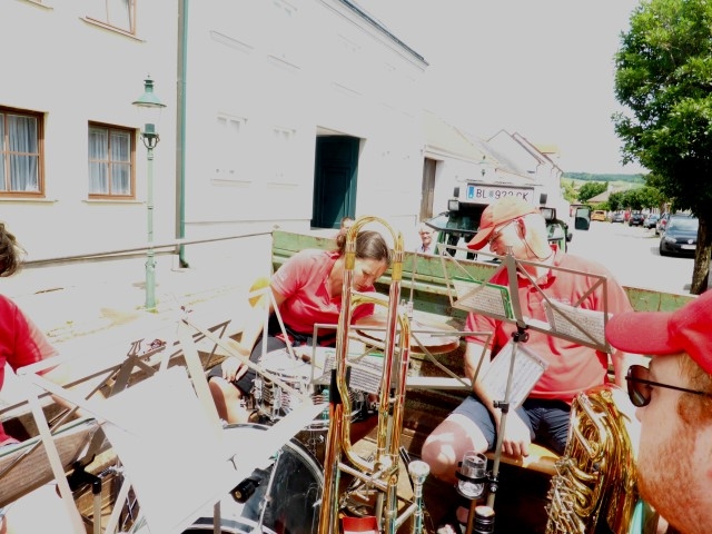 Um ca 9 Uhr machten wir uns auf den Weg nach Arbesthal zu unserer Musikkollegin Claudia-Elisabeth Schwarz, um uns dort mit einem Frühstück für den Tag zu stärken. Danach ging es wieder nach Göttlesbrunn, wo in brütender Hitze von Haus zu Haus marschiert und zum Musikerkirtag bzw. Oktoberfest eingeladen wurde. Ein kleiner Teil der Musikanten wurde wieder mit dem Traktor durch die Ortschaft chauffiert und sorgte so für musikalische Begleitung. Hierbei möchten wir uns bei Franz Taferner recht herzlich bedanken, welcher uns auch heuer Traktor und Anhänger zur Verfügung stellte. Aufgrund der tropischen Temperaturen kam jede Einladung auf eine Erfrischung gerade recht. Sowohl dafür, als auch für die zahlreichen Spenden möchten wir uns nocheinmal recht herzlich bedanken. |