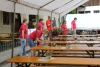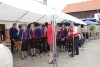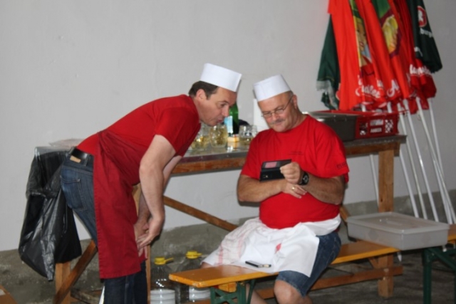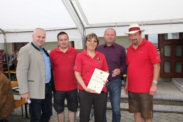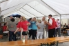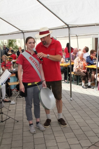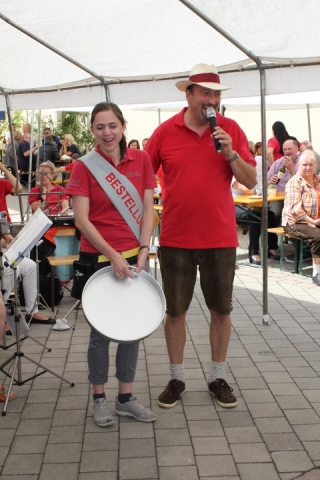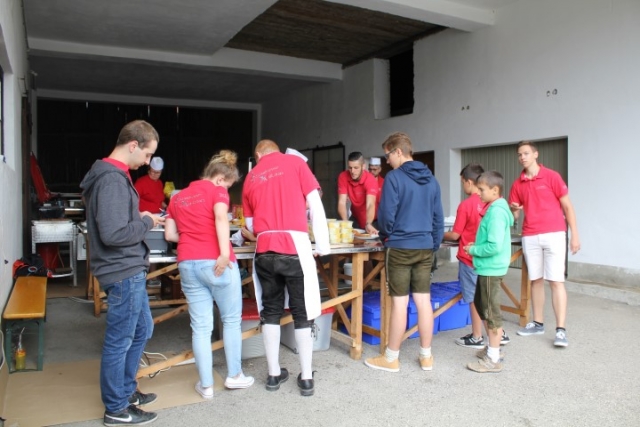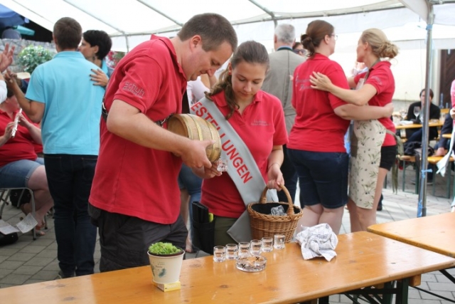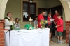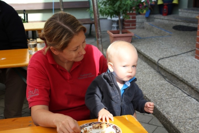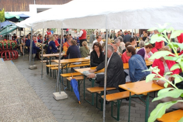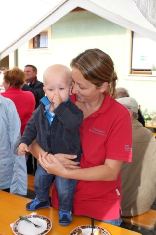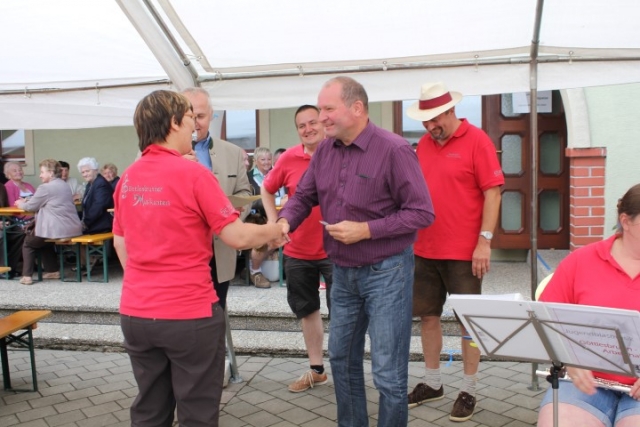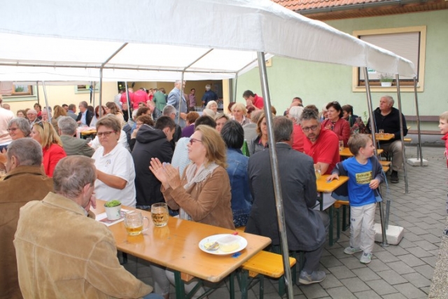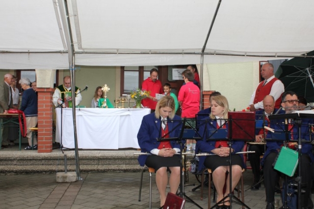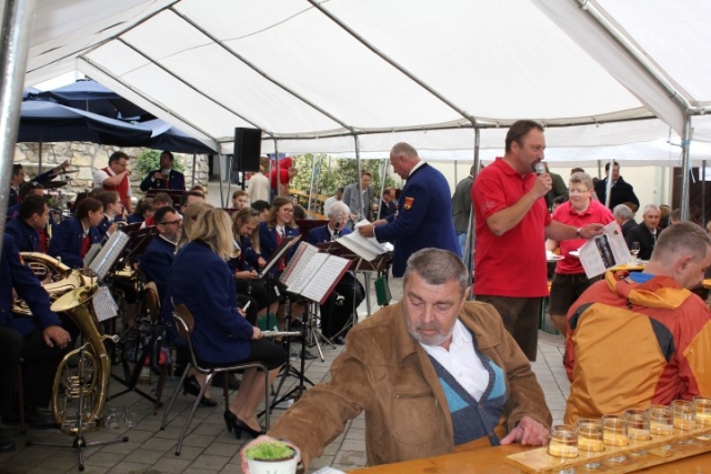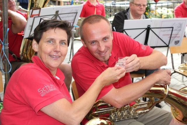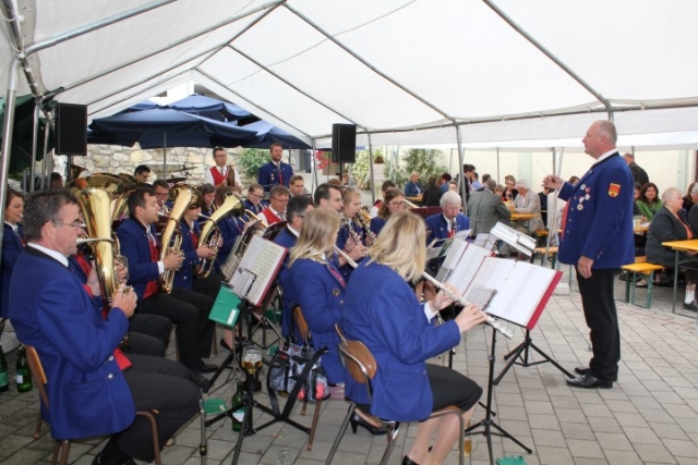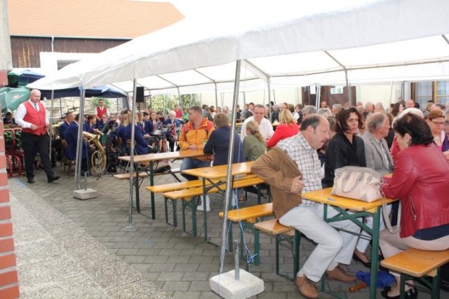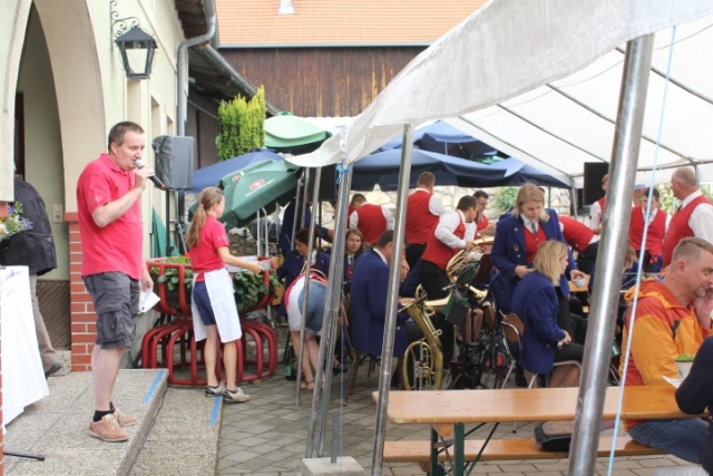 Der Kirtag wurde durch eine Feldmesse von Herrn Pfarrer Dechant Paul Gnat um 10 Uhr feierlich eröffnet. Diese wurde von der Blasmusik Bruck/Leitha musikalisch umrahmt. Auch die anschließenden Stunden wurden mit einem sehr stimmungsvollen Frühschoppen von unserer Gastkapelle aus Bruck/Leitha gestaltet. Trotz des verregneten Vormittags war der Hof gut gefüllt und es herrschte gemütliche Feststimmung. Gegen 14.00 Uhr wurde von unserem Kapellmeister Bernhard Fischer das Ergebnis des Schätzspiels verkündet. Diesmal hatten wir uns eine ziemlich knifflige Frage ausgedacht. "Wie viele Frau-/Mannstunden Probenarbeit waren für das Filmmusik-Jubiläumskonzert am 24.05. notwendig?" sorgte schon mit der Findung des richtigen Rechenweges für einige Diskussionen. Doch schlussendlich wurde errechnet, dass 1741,5 Probenstunden für das Konzert aufgebracht wurden. Diese Zahl konnte auch ziemlich genau erraten werden. Mit 1740 errechneten Stunden teilten sich Familie Bohrn und Familie Gutschik den ersten Platz und bekamen jeweils einen gutbestückten Weinkorb + Gutschein überreicht. Im Anschluss durfte wieder ein kleiner Teil der Jugendblasmusik die Gäste mit bekannten Märschen und Polkas unterhalten. Zwischendurch wurde auch wieder eine Ehrung von Bürgermeister Ing. Franz Glock und Vizebürgermeister Franz Schwarz durchgeführt. Unsere Klarinettistin Manuela Flamm bekam "In Würdigung der besonderen Verdienste um die Gemeinde Göttlesbrunn-Arbesthal das Bronzene Ehrenzeichen der Gemeinde Göttlesbrunn-Arbesthal" verliehen. Am Abend ließen die zahlreichen HelferInnen und noch anwesenden Gäste bei einigen Gläsern Wein den Musikerkirtag ausklingen. Die Jugendblasmusik möchte sich hier nochmals recht herzlich bei allen HelferInnen, bei den Göttlesbrunner Winzern für die großzügigen Weinspenden und natürlich bei all jenen, die immer wieder unsere Veranstaltungen besuchen, bedanken. Ein großer Dank gilt natürlich auch der Familie Paul, die uns nun schon zum 8. Mal ihren Hof für dieses Fest zur Verfügung stellte. |