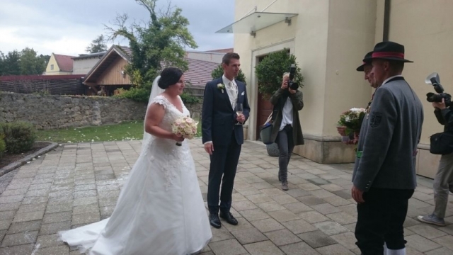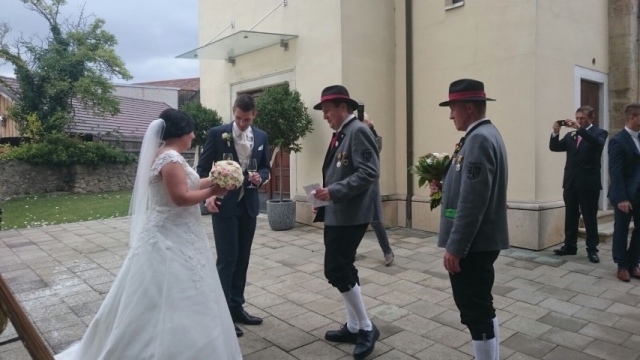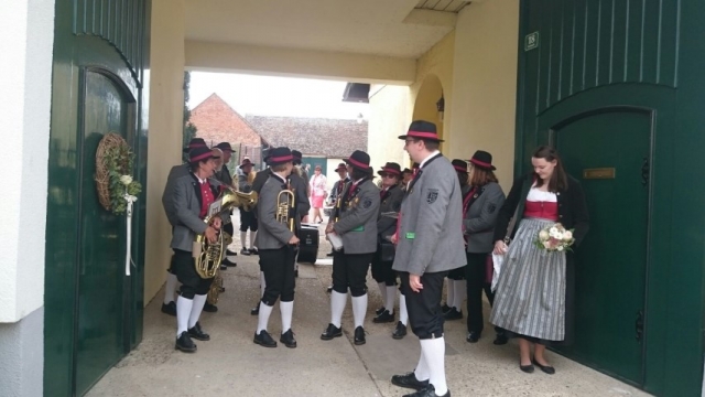 Um zirka 13.30 Uhr wurde mit klingendem Spiel in den Hof der Familie Glock in Göttlesbrunn einmarschiert, wo sich bereits die geladenen Festgäste und der Bräutigam versammelt hatten. Dort spielten wir einige Stücke, bevor wir uns wieder in Marschformation aufstellten, um den Hochzeitszug in die Kirche anzuführen. Nach der Messe fand auf dem Kirchenplatz eine Agape statt, welche wie immer musikalisch umrahmt wurde. Um zirka 18.30 Uhr marschierten wir dann mit der Hochzeitsgesellschaft zum Restaurant "Der Jungwirt", wo zur Hochzeitstafel geladen wurde. Wir möchten uns nochmals recht herzlich für die Einladung bedanken und wünschen Magdalena und Roman für ihre gemeinsame Zukunft alles Liebe und Gute. |
