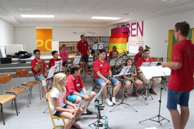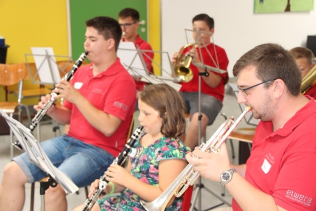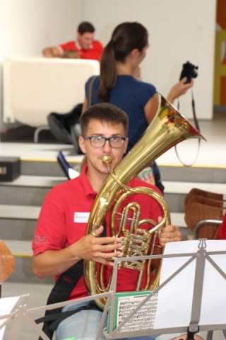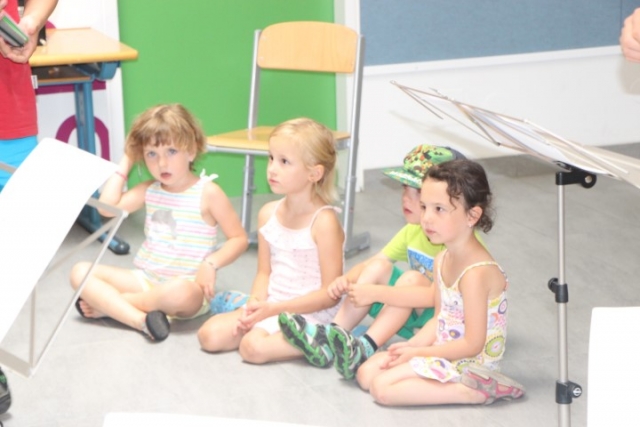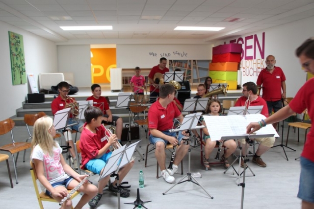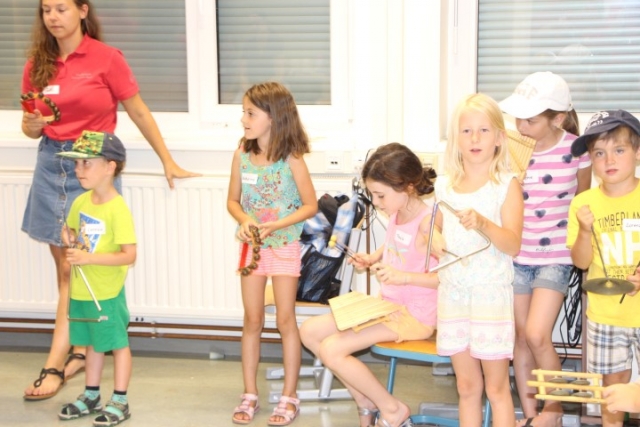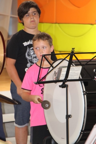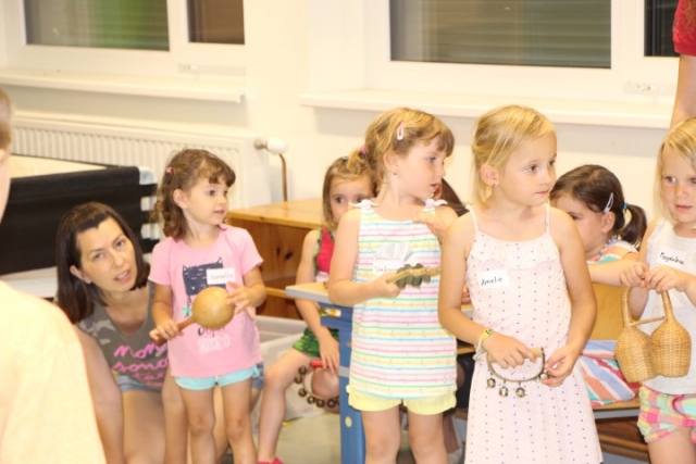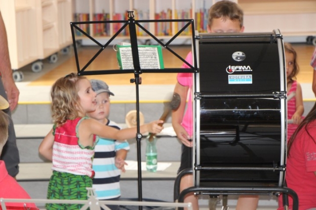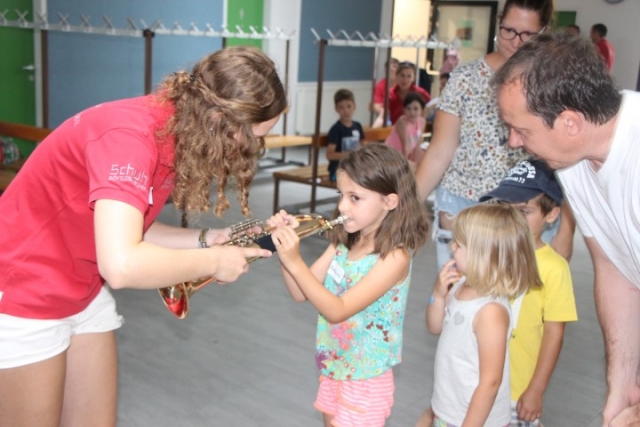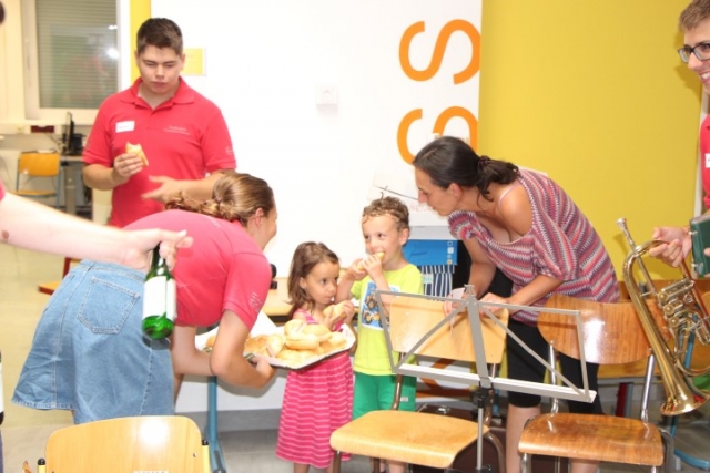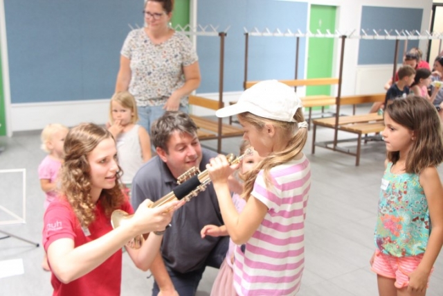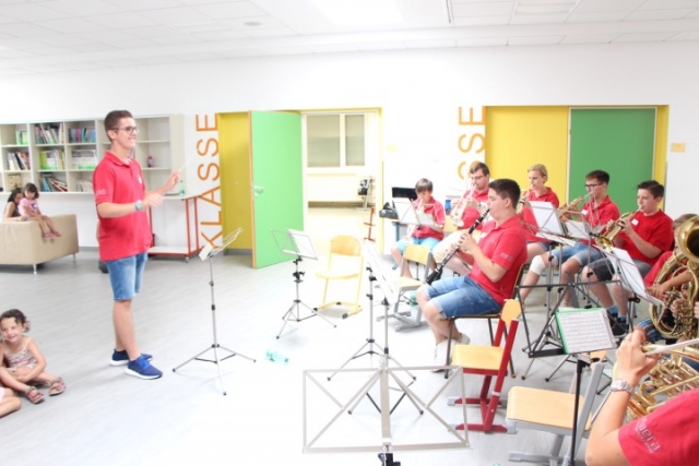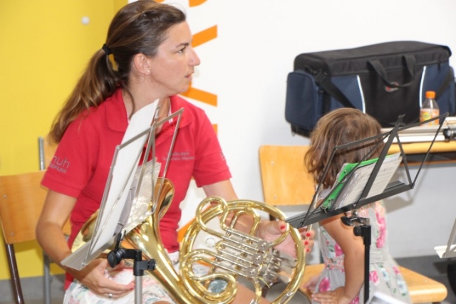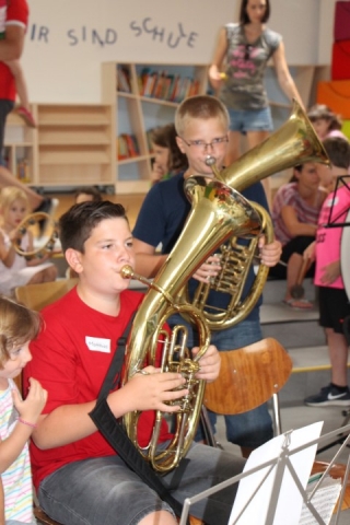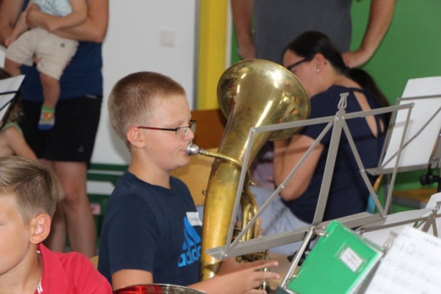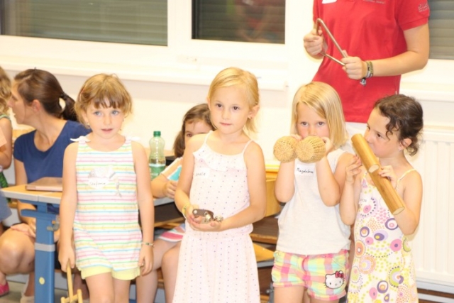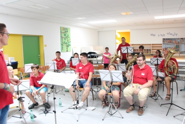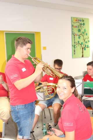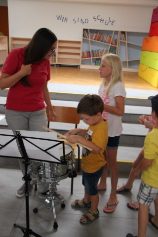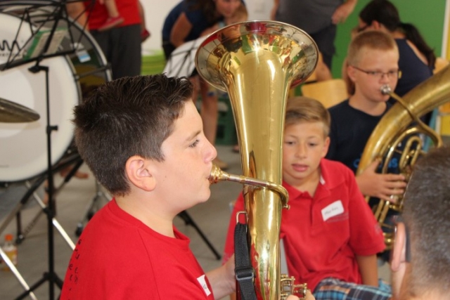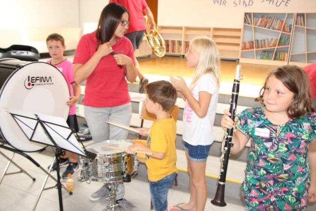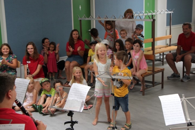Am 20. Juli trafen sich einige MusikerInnen und zahlreiche Kinder in der Volksschule in Göttlesbrunn. Die Kinder wurden in zwei Gruppen aufgeteilt. Jene, die schon ein Instrument spielen konnten, bildeten mit uns "großen" Musikern ein kleines Orchester und studierten unter der Leitung von Thomas Krackhofer ein einfaches Stück ein, welches allen anderen am Ende vorgetragen wurde. Die restlichen Kinder vergnügten sich bei lustigen Laufspielen und stellten ihr musikalisches Talent bei der Station "Welches Instrument ist das?" unter Beweis. Dabei wurden den Kindern kurze Hörbeispiele von verschiedenen Instrumenten vorgespielt, welche zu erraten waren. Danach wurden von den MusikerInnen noch ein Marsch und eine Polka vorgetragen, wobei alle Kinder fleißig mitklatschten. Zum Abschluss durften die Kinder alle Instrumente ausprobieren und versuchen einen Ton zu spielen, was bei dem ein oder anderen Instrument gar nicht so einfach war. Es war für alle Beteiligten wieder ein sehr schöner und lustiger Nachmittag und wir freuen uns schon auf nächstes Jahr. |