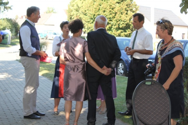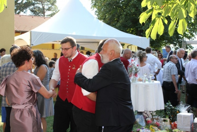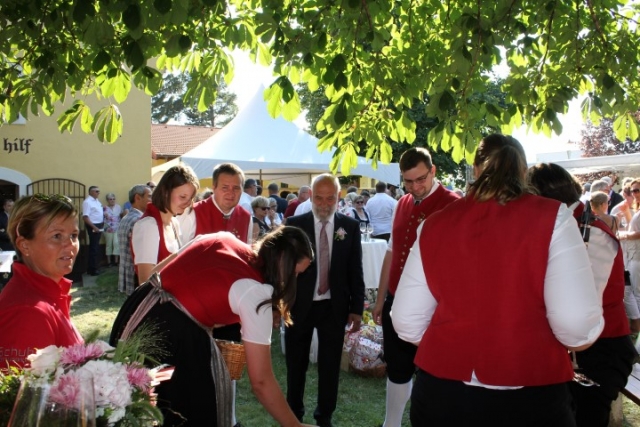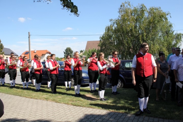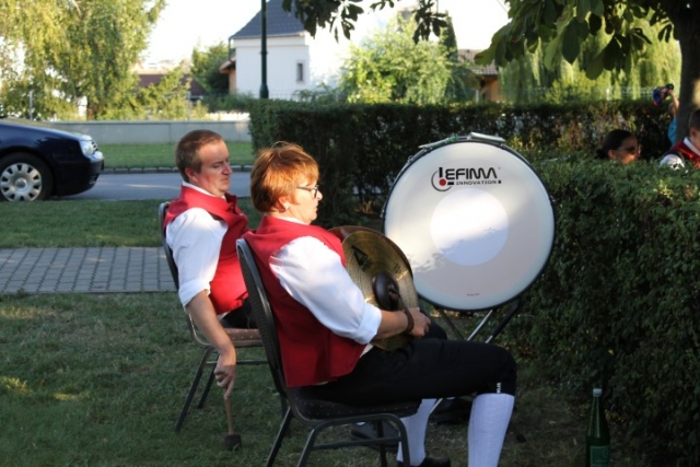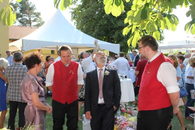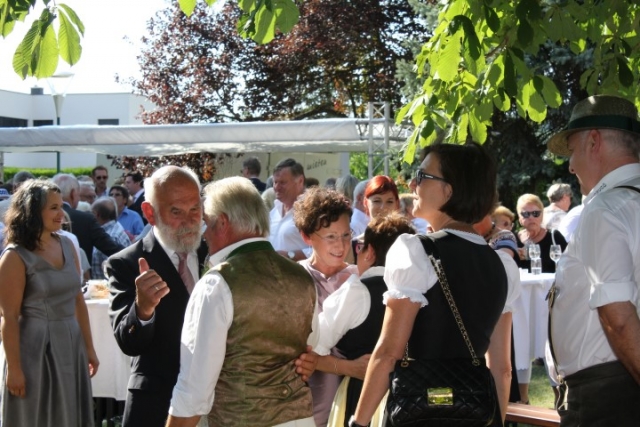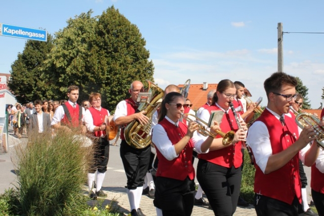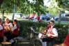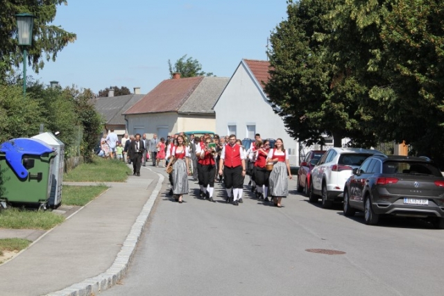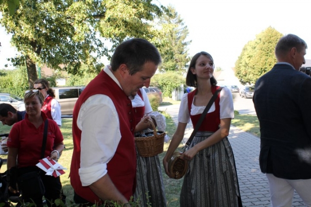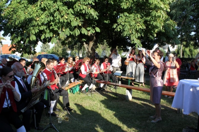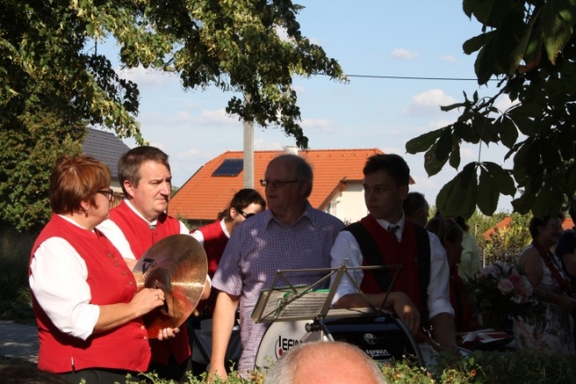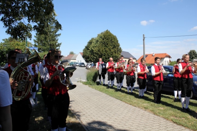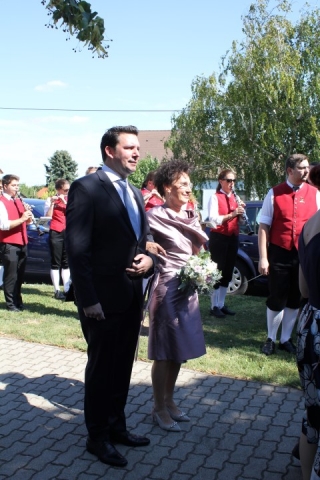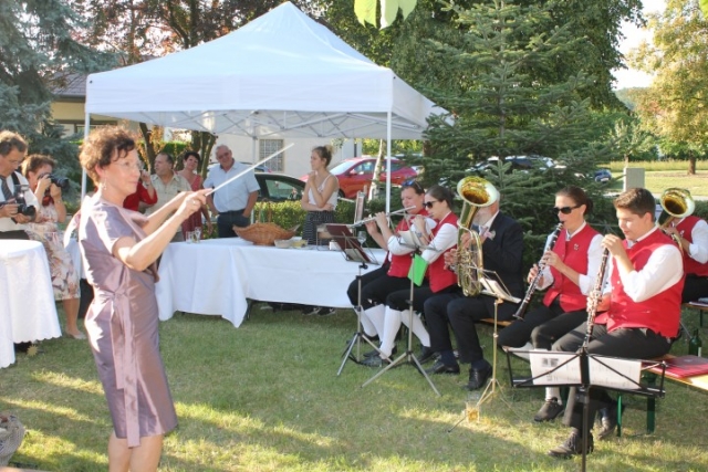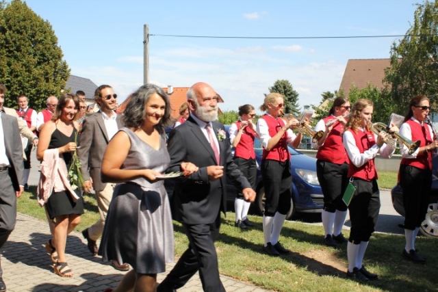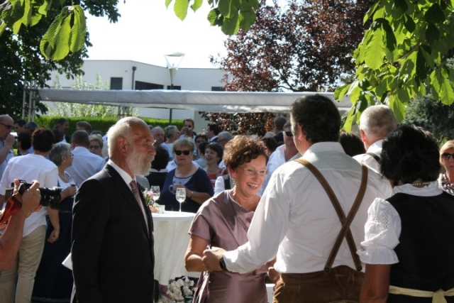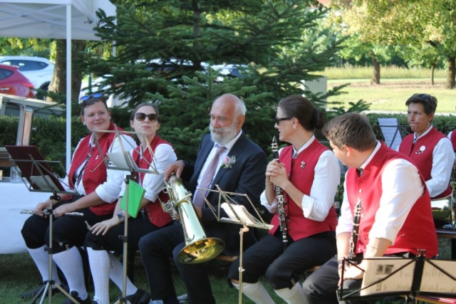 Familie, Freunde und die MusikantInnen der Jugendblasmusik trafen sich bei Roswitha zu Hause, um danach den Hochzeitszug in die Kirche zu bilden. Vor der Kirche bekam das Brautpaar den christlichen Segen, den auch die Jugendblasmusik mit dem allseits bekannten Lied "Halleluja" mitgestalten durfte. Danach fand eine Agape statt, die wir ebenfalls musikalisch umrahmten. Für kleine Köstlichkeiten und kalte Getränke wurde reichlich gesorgt, worüber jeder aufgrund der tropischen Temperaturen erfreut war. Wir wünschen unserem Musikkollegen Karl und seiner Roswitha auch hier nochmals alles Gute, Gesundheit und Glück für ihre weitere Zukunft. |