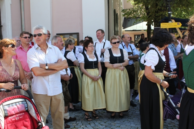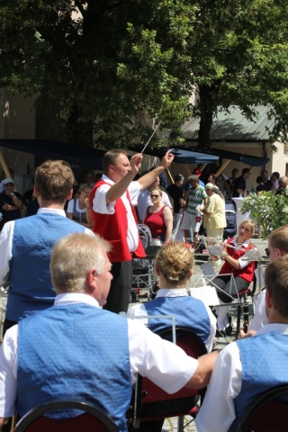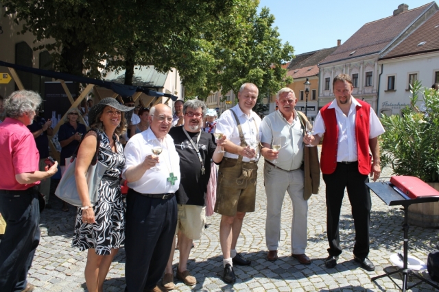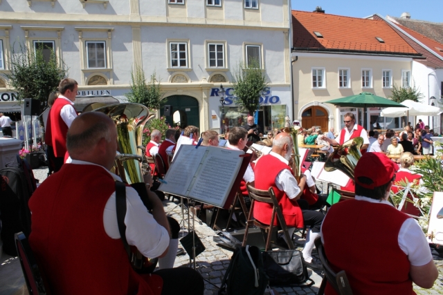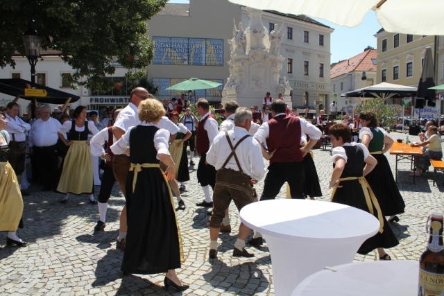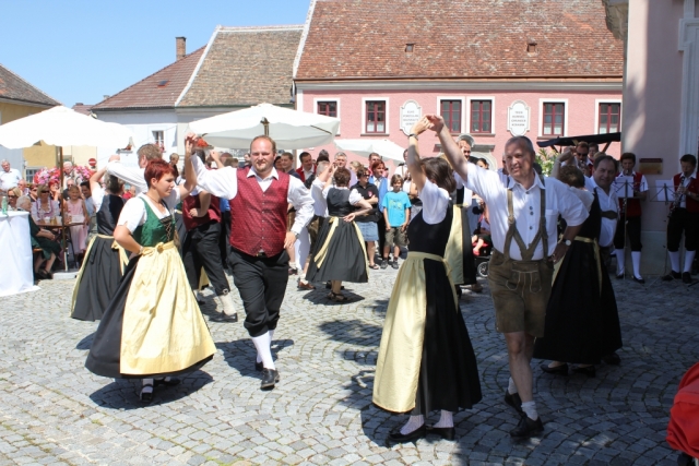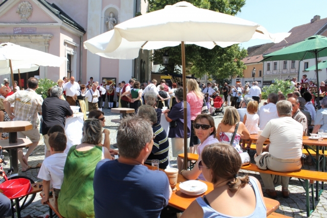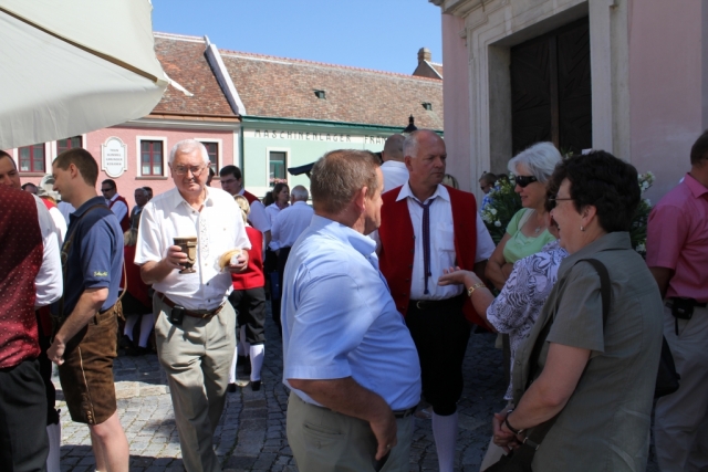 Der Vormittag startete um 09.00 Uhr mit einer Messe in der Pfarrkirche Hainburg/Donau. Diese wurde vom Kirchenchor Göttlesbrunn-Arbesthal feierlich umrahmt. Im Anschluss daran stellte unser Bürgermeister Ing Franz Glock die Gemeinde Göttlesbrunn/Arbesthal, mit einigen Worten vor. Ab 10.00 Uhr spielte die Trachtenkapelle Arbesthal einen einstündigen Frühschoppen für die bereits zahlreich anwesenden Gäste. Danach führte die Volkstanzgruppe KUGRU Göttlesbrunn gemeinsam mit den Orwasthola Razn einige Volkstänze vor. Nach den Tänzen sorgte die Jugendblasmusik Göttlesbrunn-Arbesthal eine Stunde lang für die musikalische Unterhaltung. Gegen 12.00 Uhr führten die beiden Volkstanzgruppen nochmals drei Tänze vor. Zum Abschluss spielten beide Musikkapellen gemeinsam einige Märsche für die noch anwesenden Besucher. Für Speis und Trank wurde vom Cafe Eckerl gesorgt. Weiters waren auch die beiden Weinbauvereine von Göttlesbrunn und Arbesthal vor Ort, sowie Grete Wiederstein mit zahlreichen Edelbränden. Diese beiden Stände wurden durch die anwesenden Gäste zahlreich besucht.Trotz der extremen Hitze blieben zahlreiche Gäste bis zum Ende des Frühschoppen.