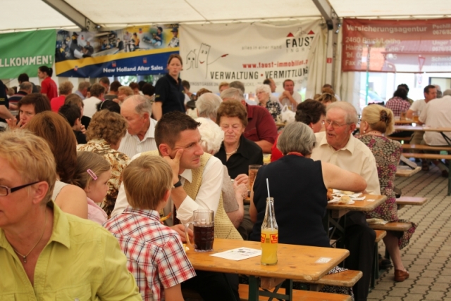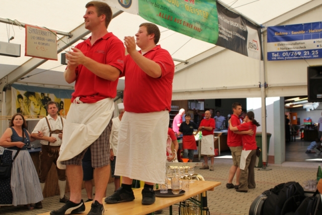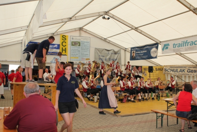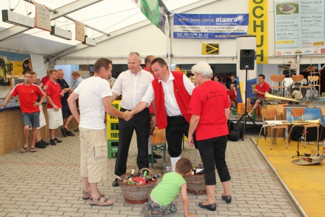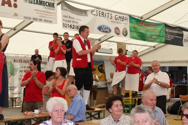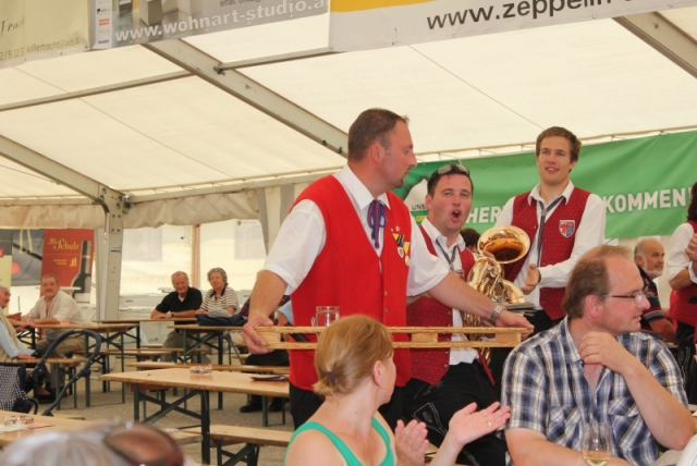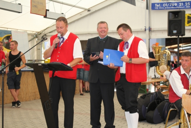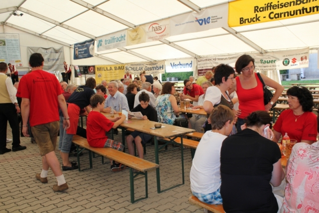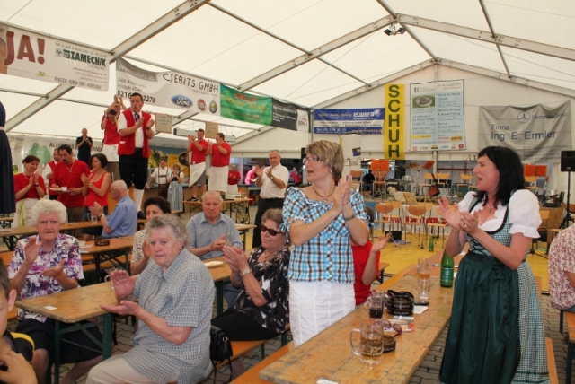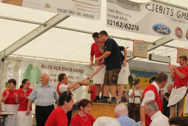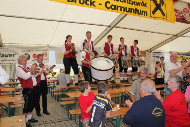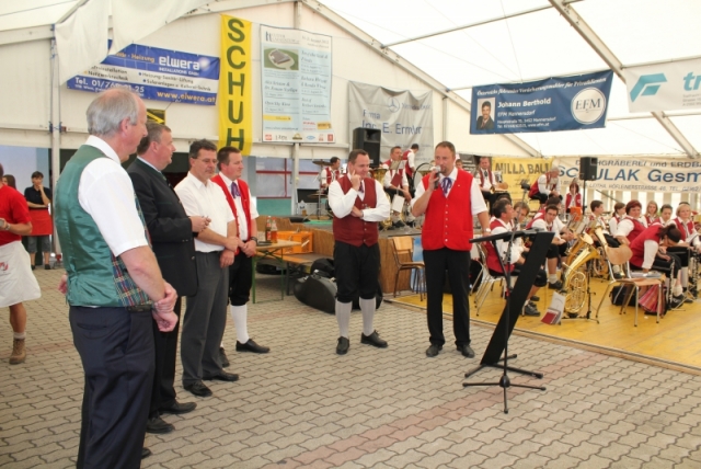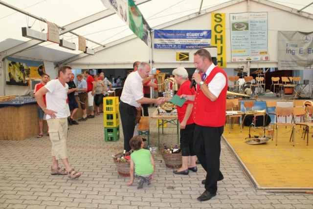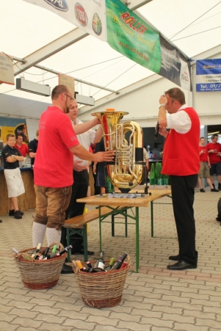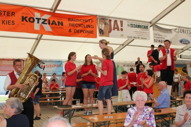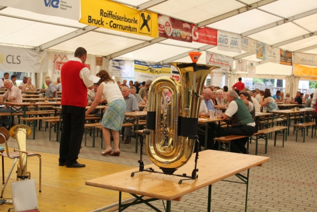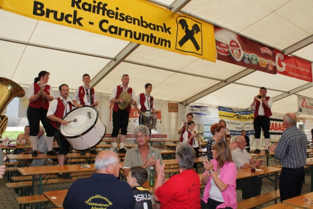 Danach übernahm der Musikverein Schwadorf die musikalische Unterhaltung im Festzelt. Bei Musikstücken wie „Böhmischer Traum“, „Dem Land Tirol die Treue“ oder dem „Wagramer Grenadiermarsch (mit Schlagzeugsolo)“ herrschte eine hervorragende Stimmung im Festzelt, wobei zahlreiche Festgäste auf den Bänken und Tischen lautstark mitklatschten und mittanzten. Aufgrund der guten Stimmung spielte der Musikverein Schwadorf bis ca 15.00 Uhr. Danach wurde durch den Kapellmeister Bernhard Fischer unter der strengen Aufsicht des Hr Bürgermeister Ing. Franz Glock das Schätzspiel durchgeführt. Als Frage war, wie viele sechzehntel Liter Wasser in eine Tuba passen würden. Dabei wurden genau 293 Sechzehntel ermittelt. Die ersten Plätze gingen an Herta Hartl und Anton Sebjanic, welche mit 295 Sechzehntel am nähesten waren. Auf dem zweiten Platz mit 298 Sechzehntel landete Günther Thunshirn. Den Gewinnern wurden Weinkörbe und Gutscheine überreicht. Nach Beendigung der Verlosung gönnten sich auch alle MusikerInnen und HelferInnen zum gemütlichen Ausklang noch das eine oder andere Achterl Wein bzw Krügerl Bier. Die Jugendblasmusik Göttlesbrunn-Arbesthal konnte sich über ein sehr gut besuchtes Bezirksmusikfest freuen.
