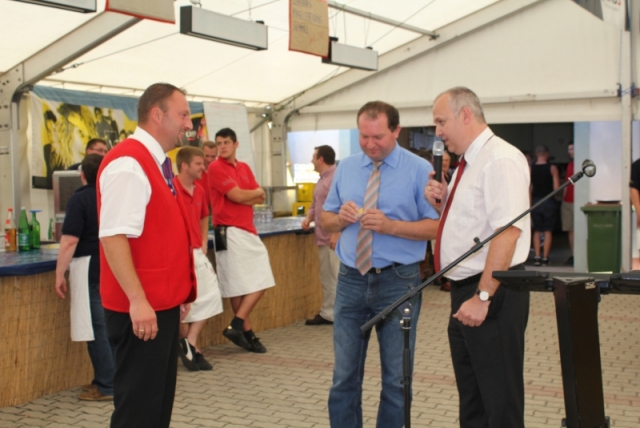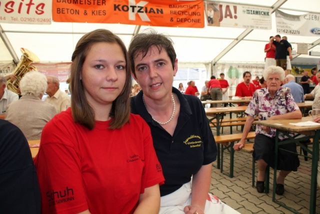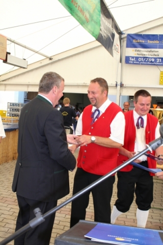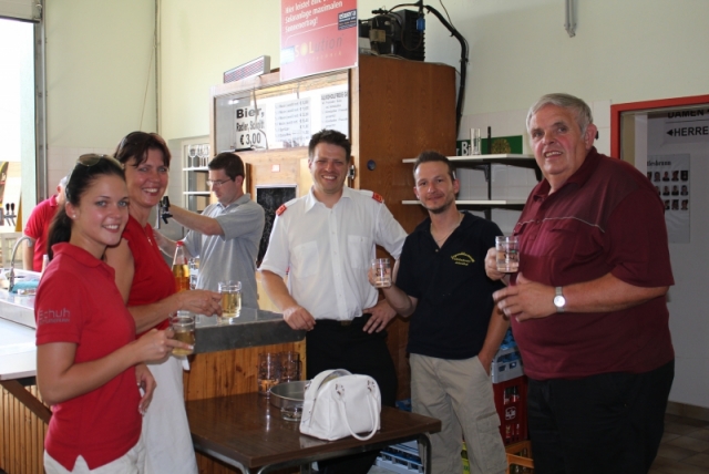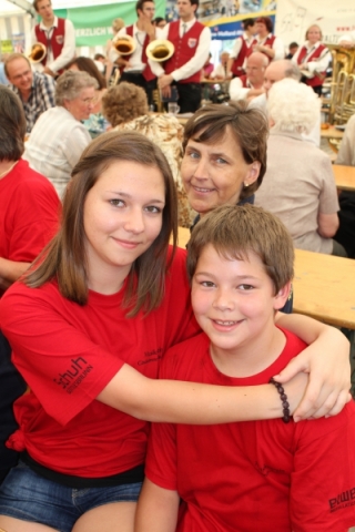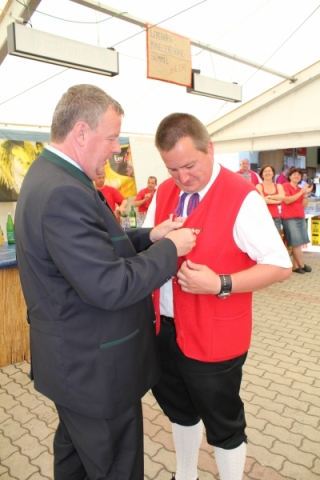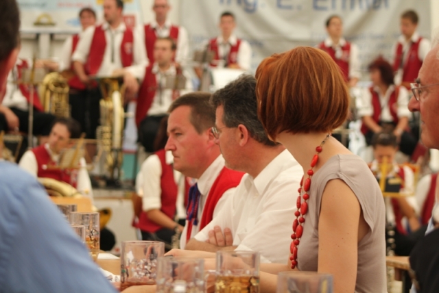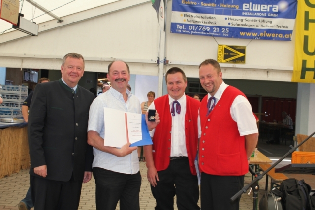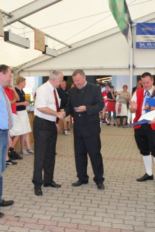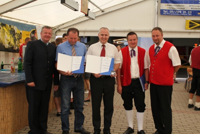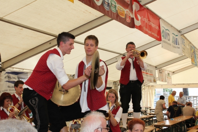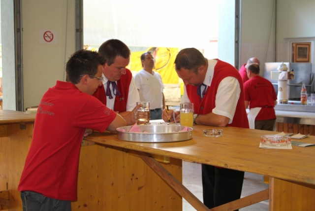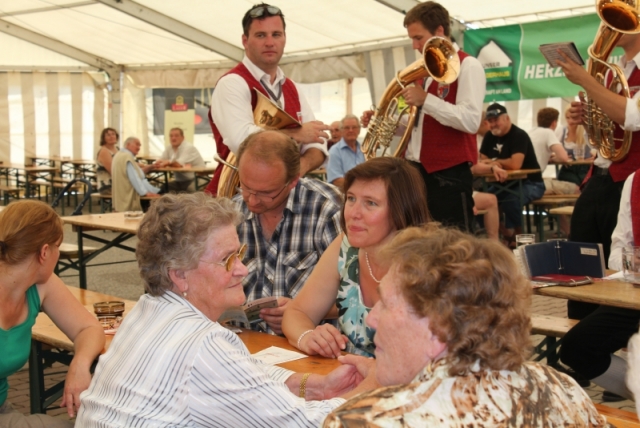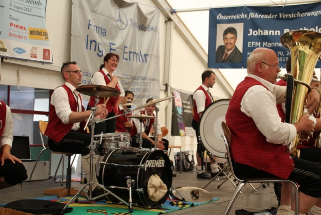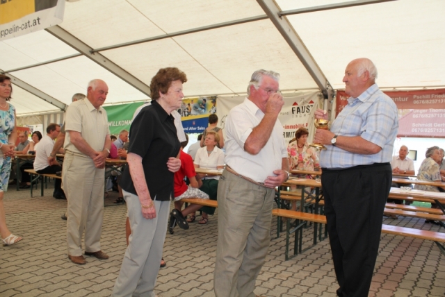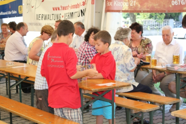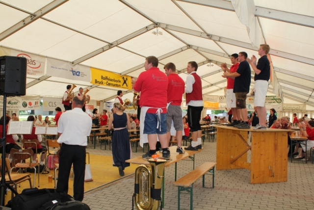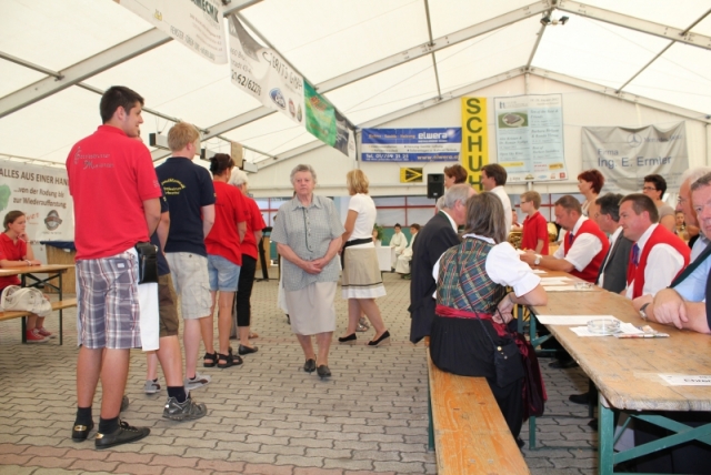 Danach übernahm der Musikverein Schwadorf die musikalische Unterhaltung im Festzelt. Bei Musikstücken wie „Böhmischer Traum“, „Dem Land Tirol die Treue“ oder dem „Wagramer Grenadiermarsch (mit Schlagzeugsolo)“ herrschte eine hervorragende Stimmung im Festzelt, wobei zahlreiche Festgäste auf den Bänken und Tischen lautstark mitklatschten und mittanzten. Aufgrund der guten Stimmung spielte der Musikverein Schwadorf bis ca 15.00 Uhr. Danach wurde durch den Kapellmeister Bernhard Fischer unter der strengen Aufsicht des Hr Bürgermeister Ing. Franz Glock das Schätzspiel durchgeführt. Als Frage war, wie viele sechzehntel Liter Wasser in eine Tuba passen würden. Dabei wurden genau 293 Sechzehntel ermittelt. Die ersten Plätze gingen an Herta Hartl und Anton Sebjanic, welche mit 295 Sechzehntel am nähesten waren. Auf dem zweiten Platz mit 298 Sechzehntel landete Günther Thunshirn. Den Gewinnern wurden Weinkörbe und Gutscheine überreicht. Nach Beendigung der Verlosung gönnten sich auch alle MusikerInnen und HelferInnen zum gemütlichen Ausklang noch das eine oder andere Achterl Wein bzw Krügerl Bier. Die Jugendblasmusik Göttlesbrunn-Arbesthal konnte sich über ein sehr gut besuchtes Bezirksmusikfest freuen.