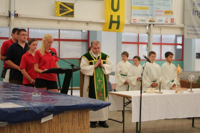 Ab 10.00 Uhr feierte Dechant Paul Gnat mit den zahlreich erschienenen Festbesuchern die heilige Messe. Im Anschluss daran fanden durch den niederösterreichen Blasmusikverbandsobmann Peter Höckner und den Bezirksobmann der BAG Bruck/Leitha, Bernhard Fischer zahlreiche Ehrungen von anwesenden MusikerInnen aus dem Bezirk Bruck/Leitha statt.
