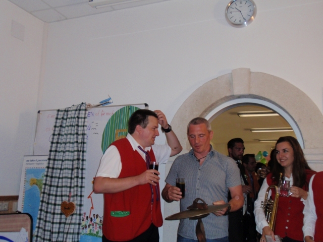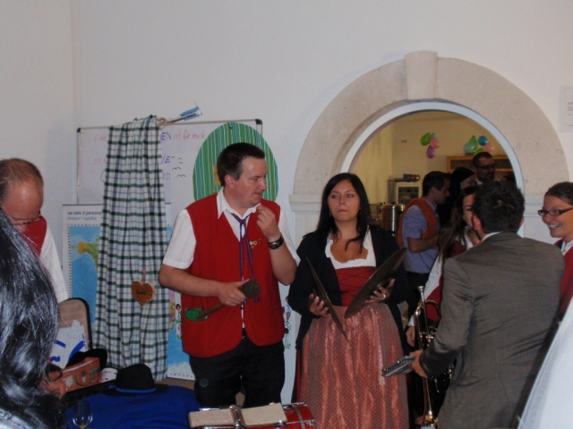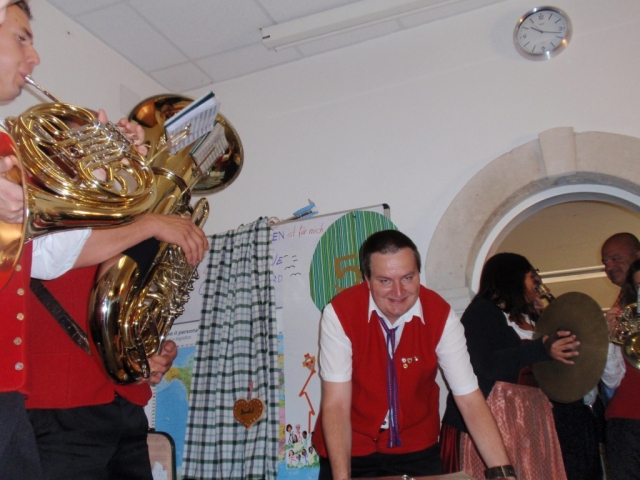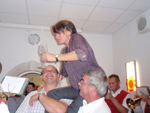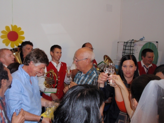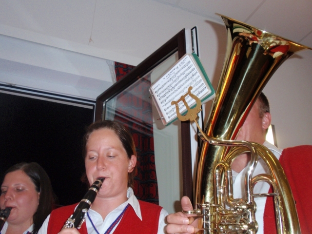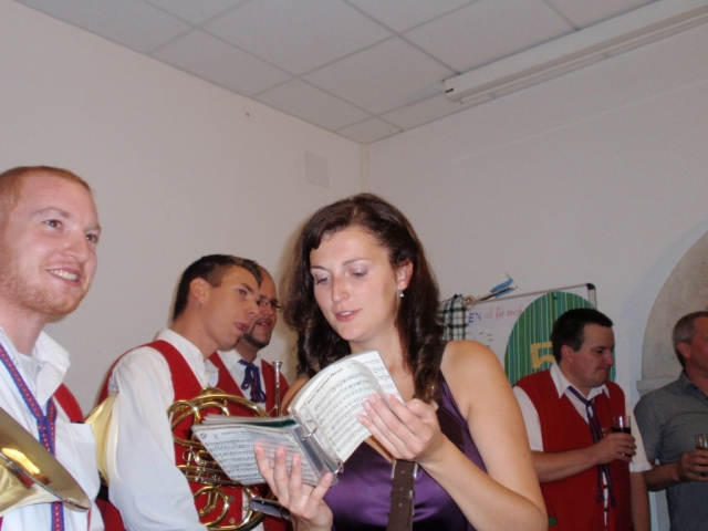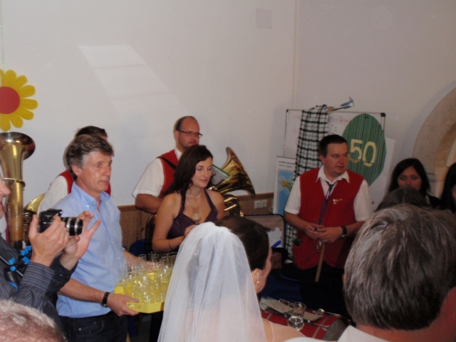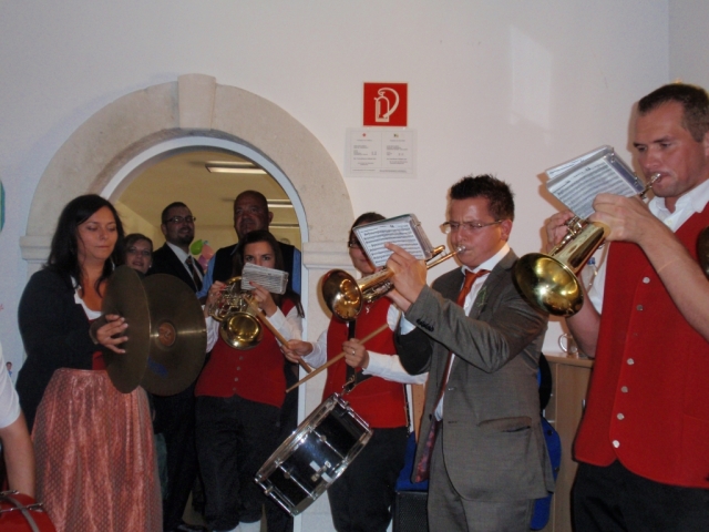 Da man nach der musikalischen Umrahmung der Hochzeit noch immer spielfähig war, entschieden sich die noch anwesenden MusikerInnen kurzerhand noch im Pfarrhof bei der 50-Feier vorbeizuschauen und für das "Geburtstags-Kind" ein Ständchen zu spielen. Dabei marschierten wir mit dem Göttlesbrunner Musikantenmarsch in den Pfarrhof ein und überraschten die anwesenden Gäste. Danach wurden noch einige Märsche und Polka zum Besten gegeben, wobei fleißig dazu getanzt wurde. Während den Musikstücken traf auch unerwartet die Braut mit den "Brautverzahrern" im Pfarrhof ein und kurze Zeit später der suchende Bräutigam, welche ebenfalls tatkräftig mittanzten. Die MusikerInnen wünschen auf diesem Wege zum runden Geburtstag nochmals alles Gute. |