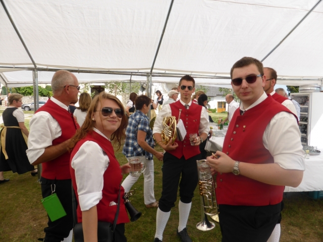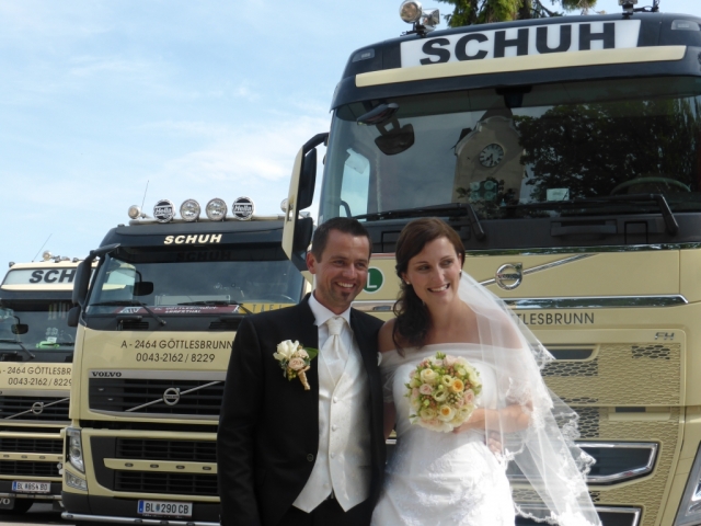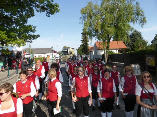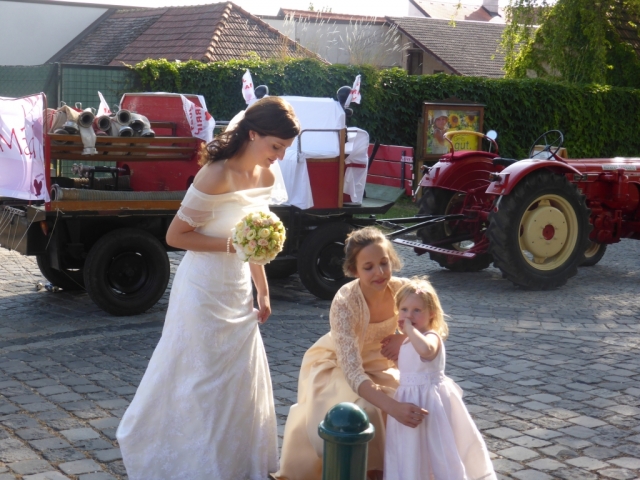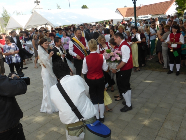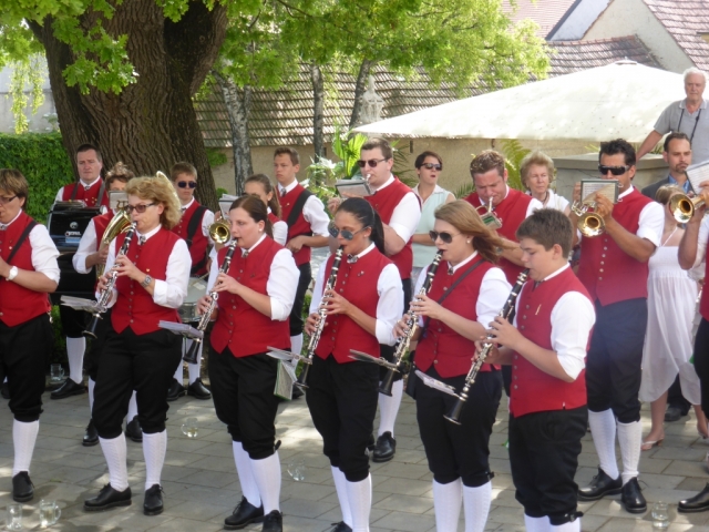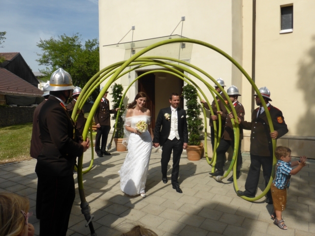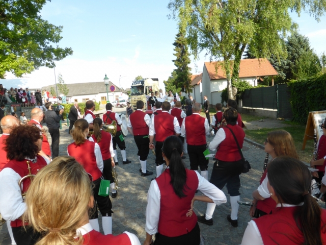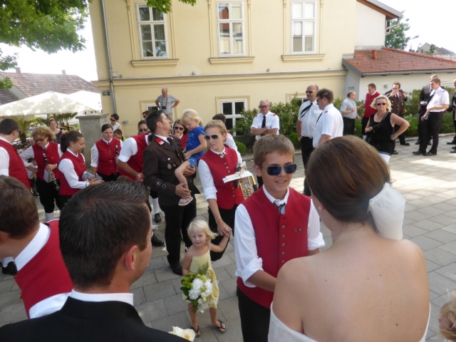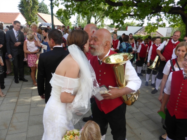 Dabei trafen wir uns gegen 13.00 Uhr im Feuerwehrhaus und marschierten anschließend zur Familie Schuh. Dort warteten bereits zahlreiche geladene Gäste und der zukünftige Bräutigam. Im Hof der Familie Schuh wurden anschließend mehrere Märsche und Polka zum Besten gegeben. Gegen 14.15 Uhr marschierte die Jugendblasmusik gemeinsam mit dem Festzug in die Pfarrkirche Göttlesbrunn. Nach der Messe wurde auf dem Kirchenplatz zu einer Agape geladen. Diese wurde von den MusikerInnen musikalisch umrahmt. Im Anschluss daran marschierten die Jugendblasmusik, das neu vermählte Brautpaar und deren Gäste zum Lokal Jungwirth, wo zur Hochzeitstafel geladen wurde, wobei das Brautpaar mit einem Oldtimer-Traktor und Feuerwehranhänger chauffiert wurde. Die MusikerInnen wurden ebenfalls zu Speis und Trank in das Lokal Jungwirth geladen, wofür wir uns noch recht herzlich bedanken möchten. Auf der Terrasse wurden anschließend bis zum Beginn der Hochzeitsmusik noch zahlreiche Märsche und Polka gespielt. Wir wünschen auf diesem Wege unserem Vereinsmitglied Martina Schuh und ihren Ehemann Christian Schuh nochmals alles Gute und viel Glück für die Zukunft.