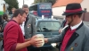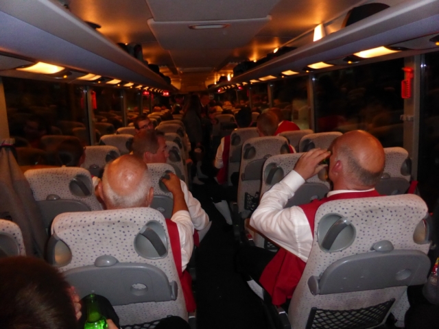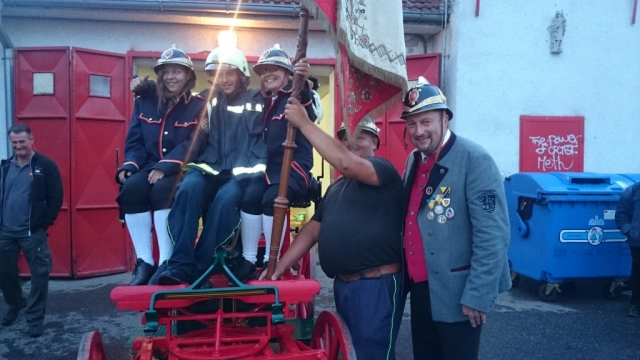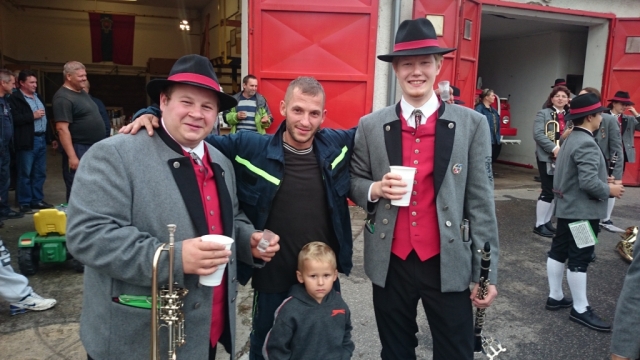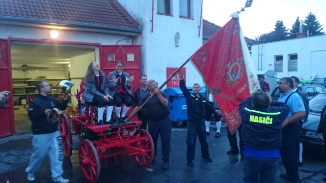 Nach Beendigung des Auftrittes mussten die MusikerInnnen auch ihre Instrumente wieder versorgen. Wie es der Zufall so wollte parkte unser Bus genau neben dem dortigen Feuerwehrhaus, wo zahlreiche Feuerwehrkameraden aus Bratislava und einige Gäste anwesend waren. Kurzfristig entschlossen wir uns, dort ebenfalls einige Märsche und Polka zum Besten zu geben. Es wurde auch gemeinsam versucht die Polka „Hei ihr Gänschen“ auf slowakisch und deutsch zu singen. Während dem kurzen Konzert wurden wir mit zahlreichen Getränken bestens versorgt. Als Höhepunkt wurde noch das Schmuckstück der dortigen Feuerwehr abgedeckt und aus der Garage geholt. Es handelte sich dabei um eine runderneuerte nostalgische Spritze, welche mit Wasser gefüllt wurde und von einigen MusikerInnen unter schwersten Körpereinsatz in Betrieb genommen wurde. Anschließend gingen wir wieder zum eigentlichen Fest zurück wo wir noch zu Speis und Trank geladen waren. Um 22.00 Uhr ging es mit dem Bus wieder zurück in Richtung Göttlesbrunn. Aufgrund des runden Geburtstages, des im Gemeinderat tätigen Harald Hold blieben wir noch kurz in Arbesthal bei der Feier stehen und sorgten mit einem Ständchen für eine gelungene Überraschung. Danach ging die Reise nach Göttlesbrunn, wo wir gegen Mitternacht eintrafen. Alles in allem war es ein schöner Ausflug zur Partnergemeinde nach Bratislava.