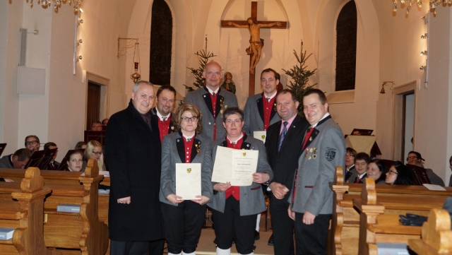 Zwischen den Musikstücken wurden auch wieder einige Ehrungen durch den Bezirksobmann Bernhard Fischer und Bürgermeister Ing. Franz Glock durchgeführt. Dabei bekam Sandra Flamm für ihre 15-jährige aktive Musikausübung die „Ehrenmedaille in Bronze“ und Maria Graßl für ihre 25-jährige aktive Musikausübung die „Ehrenmedaille in Silber“ verliehen. Weiters bekamen Maria Windholz, Eva Taferner, Ernst Taferner und Johann Graßl ein Verdienstzeichen der Gemeinde Göttlesbrunn-Arbesthal verliehen. Leider mussten sich die MusikerInnen auch von unserem Trompeter Markus Achtsnit verabschieden, welchen es nach 10-jähriger Spielzeit bei der JBM-Göttlesbrunn-Arbesthal, beruflich wieder in seine Heimat in das Waldviertel verschlägt und dieser daher aufgrund der großen Distanz nicht mehr bei uns mitspielen wird. Musikalisch wird "Maxl" jedoch bei der Grenzlandkapelle Hardegg weiterspielen. Wir wünschen "Maxl", wie er von uns MusikerInnen immer genannt wurde, nochmals alles Gute für die Zukunft und hoffen auf ein Wiedersehen beim einen oder anderen Auftritt. Gleichzeitig war das Konzert auch wieder Anlass dafür, an alle Danke zu sagen, die den Verein das ganze Jahr über tatkräftig unterstützt haben, sowohl in finanzieller Hinsicht oder mit Wein- und Sachspenden. Ein weiteres großes Dankeschön geht auch wieder an unsere „Glühweinburschen“, Johann Taferner, Hannes Taferner, Harald Herrlein, Gerhard Gratzer und Roland Huber, die mit Glühwein, Punsch und aufgrund der hohen Temperaturen auch mit Spritzer, sowie unsere Marketenderinnen Madeleine Höferl, Claudia Schulz, Ines Prügger und Sandra Schmid, die mit Aufstrichbroten für das leibliche Wohl der Gäste sorgten. Nach dem Konzert wurde das anstrengende Jahr 2014 noch ausgiebig im Vinarium Bittermann gefeiert, wobei sich auch unser Kapellmeister Bernhard Fischer nochmals bei allen MusikerInnen für das gelungene Konzert und den erbrachten Leistungen im Jahr 2014 bedankte. Abschließend möchten wir uns auch noch bei Dechant Paul Gnat bedanken, welcher die Pfarrkirche wieder für das Konzert zur Verfügung stellte.
