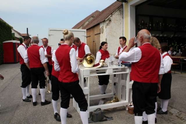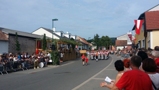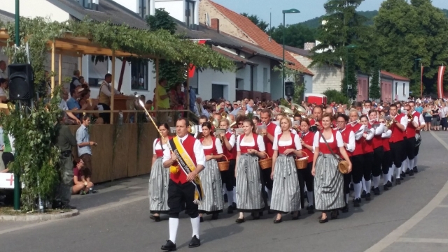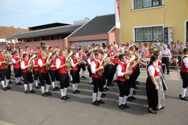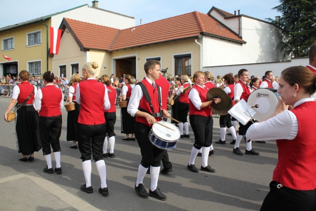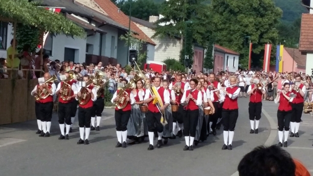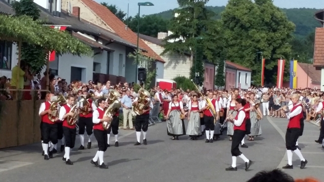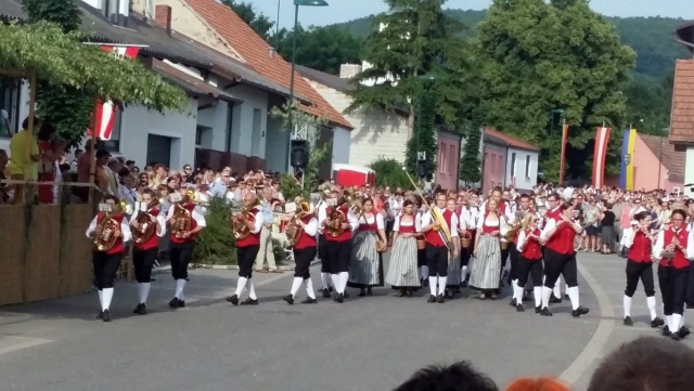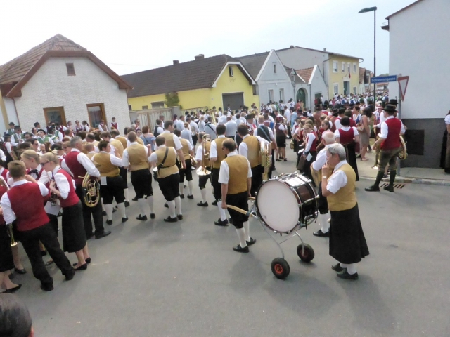 Ab 15 Uhr marschierten die 27 teilnehmenden Kapellen bei tropischen Temperaturen nacheinander ein. Ab 15.30 Uhr folgten die Begrüßungsworte und das Gemeinschaftskonzert, wobei von den ca 900 Musikanten die Musikstücke „Musica Solemnis“, „Heimat am Leithaberge Marsch“, „Oh Du mein Österreich“ und die „NÖ-Landeshymne“ zum Besten gegeben wurden. Danach startete ab 16 Uhr die Marschmusikbewertung, wobei 14 Kapellen in der höchsten Stufe „E“, 12 Kapellen in der Stufe „D“ und eine Kapelle in der Stufe A antraten. Unter der strengen Aufsicht des Bewerterteams Franz Herzog, Kapellmeister der Polizeimusik NÖ, Anton Pistotnig, ehemaliger und langjähriger Kapellmeister der Mil.Kapelle NÖ, sowie Günter Weiss, Bezirkskapellmeister in der BAG Krems wurden alle teilnehmenden Vereine bewertet.