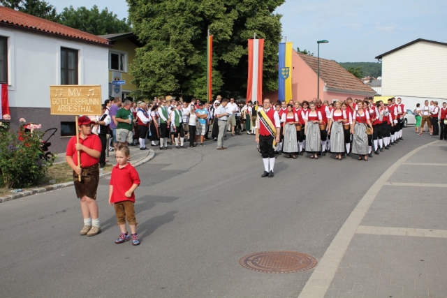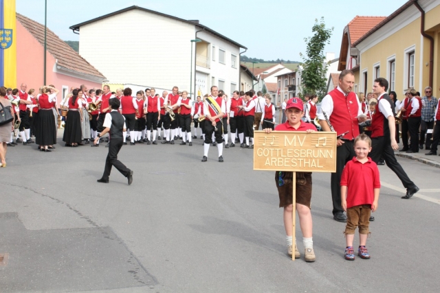 Als 11. Kapelle trat unter dem Stabführer Johann Graßl die Jugendblasmusik Göttlesbrunn-Arbesthal an. Unter den strengen Augen der Bewerter marschierte die Jugendblasmusik in der Stufe „E“ (höchste Stufe, mit Showfigur) mit dem Castaldo-Marsch die Wertungsstrecke ab. Unmittelbar nach dem Abmarschieren stand das Abfallen und Aufmarschieren und kurz danach das Stehenbleiben auf dem Programm. Danach ging die Kapelle in die breite Formation über um die große Wende durchzuführen. Im Anschluss daran kam vom Stabführer wieder das Zeichen zum Stehenbleiben und der Marsch wurde abgerissen. In weiterer Folge begann mit dem Musikstück Quando, Quando, Quando das Showprogramm wobei man eine Lyra formte und zum Schluss hin Links- und Rechtsdrehungen durchführte. Nach dem Showteil erfolgte mit dem Marsch Furchtlos und Treu wieder die Auflösung der Formation. Als Abschluss daran machte die Jugendblasmusik noch eine Rechts-Schwenkung, wo der Marsch anschließend abgerissen wurde. Gleich nach dem Abtreten zeigte sich unser Kapellmeister Bernhard Fischer über die erbrachte Leistung sehr zufrieden.