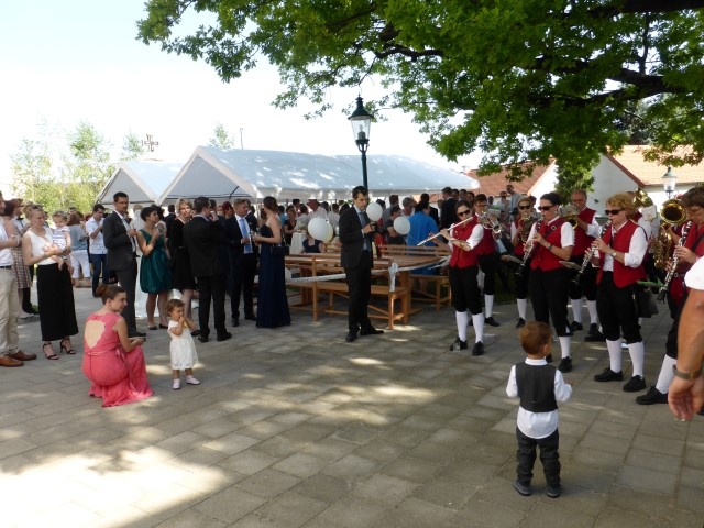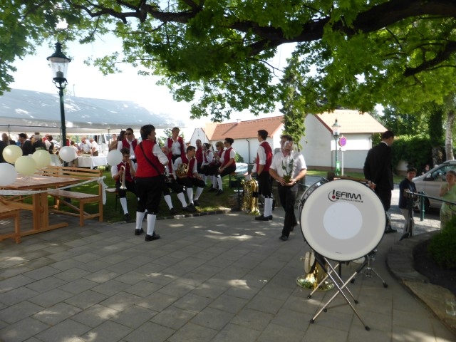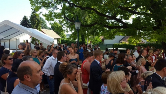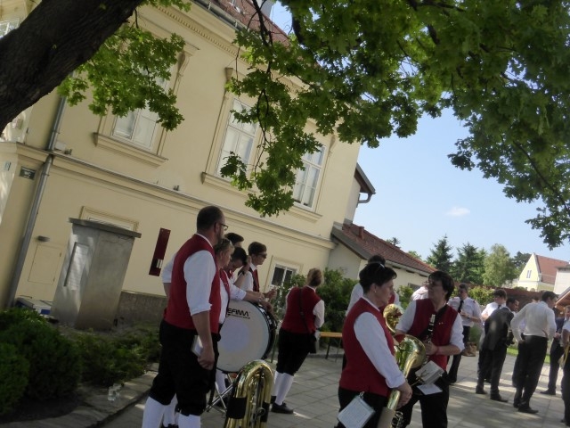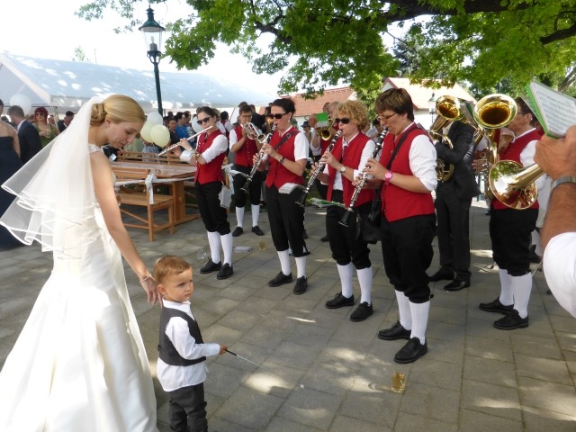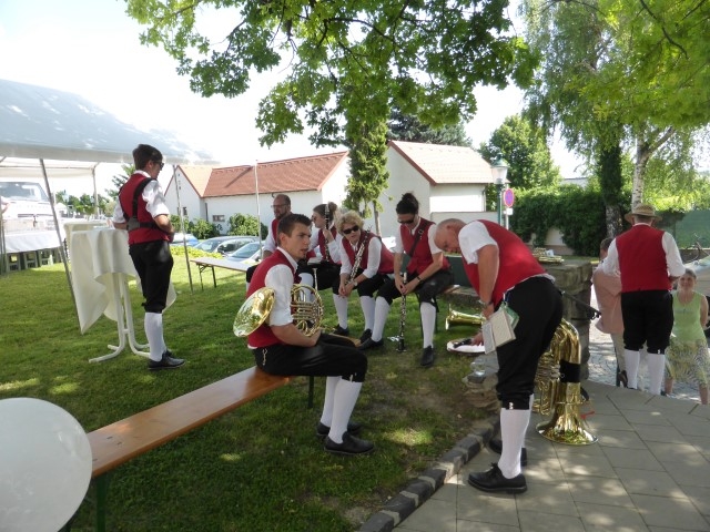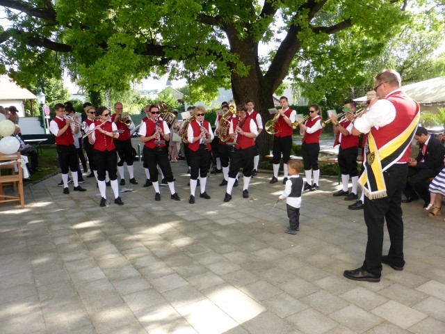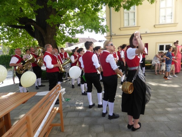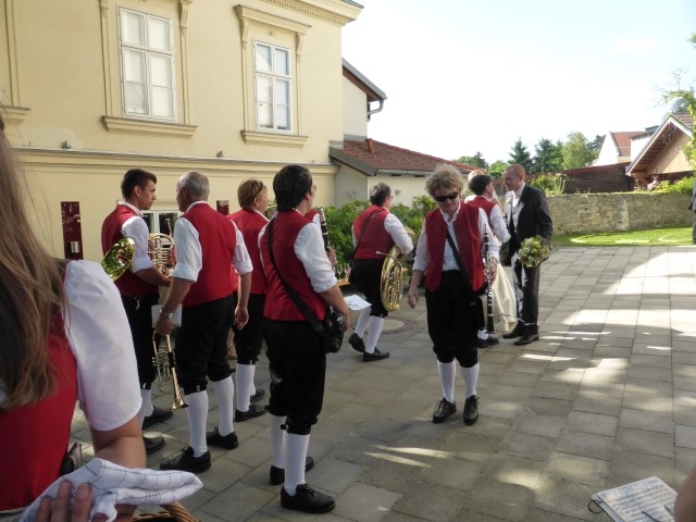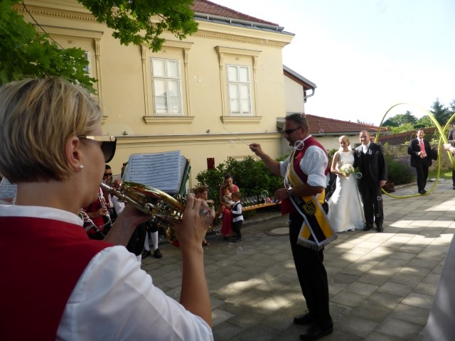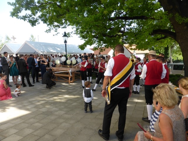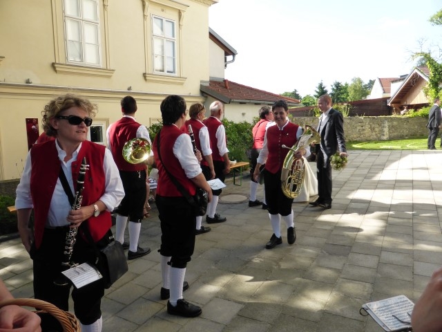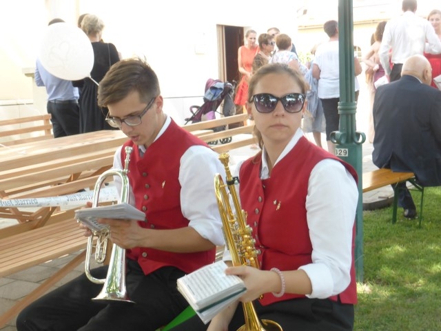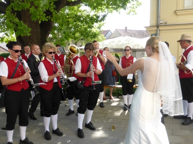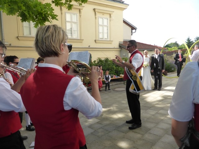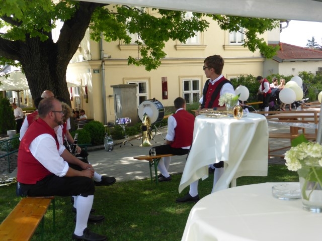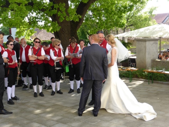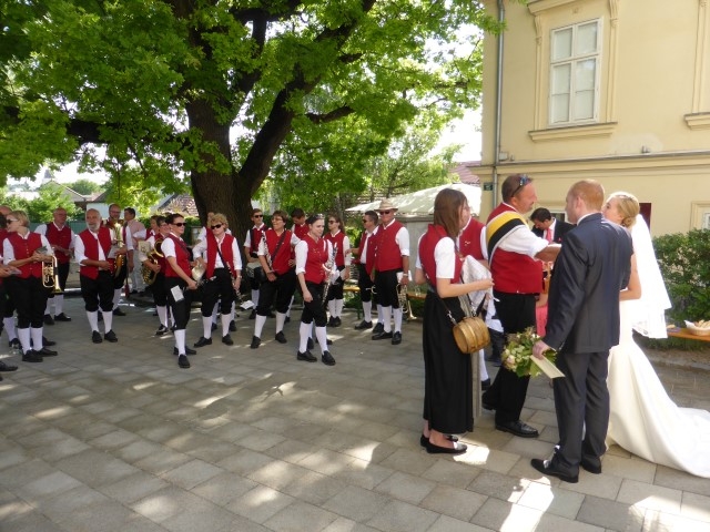 Gegen 13:30 Uhr marschierte die Jugendblasmusik in klingendem Spiel zum Elternhaus von Johannes, wo sich bereits die geladenen Gäste, sowie der Bräutigam versammelt hatten. Dort suchten wir uns erstmal ein schattiges Plätzchen, um der glühenden Hitze zumindest für ein paar Minuten zu entfliehen. Nachdem wir die Hochzeitsgesellschaft mit ein paar Stücken unterhielten, stellten wir uns wieder in Marschformation auf, um den Hochzeitszug in die Kirche anzuführen. Um 14:30 fand die Trauung in der Pfarrkirche Göttlesbrunn statt. Nach der Messe wurde auf dem Kirchenplatz zu einer Agape geladen, welche von den MusikerInnen musikalisch umrahmt wurde. Um zirka 17:30 Uhr machten sich Alle auf den Weg nach Gallbrunn in den Landgasthof Muhr, wo zur Hochzeitstafel geladen wurde. Dort nahm die Jugendblasmusik das frischgetraute Brautpaar musikalisch in Empfang, bevor man zum Essen im festlich geschmückten Saal Platz nahm. Für gute Stimmung bis in die frühen Morgenstunden sorgte die Band "Fortissimo".