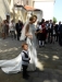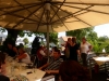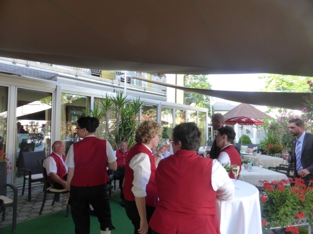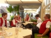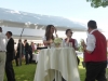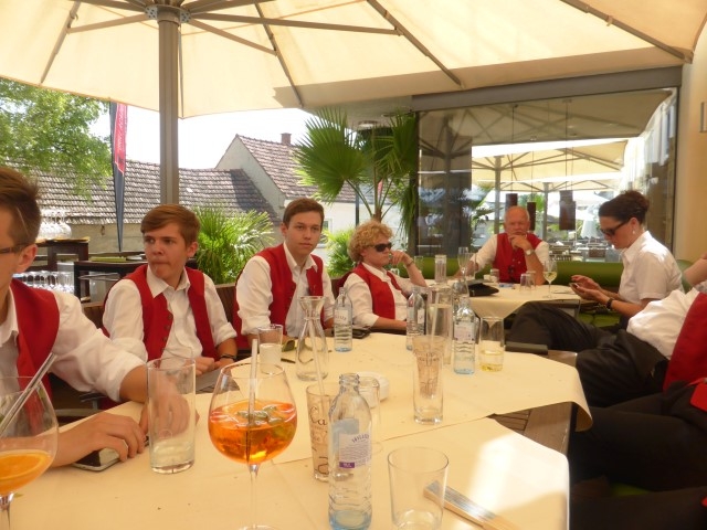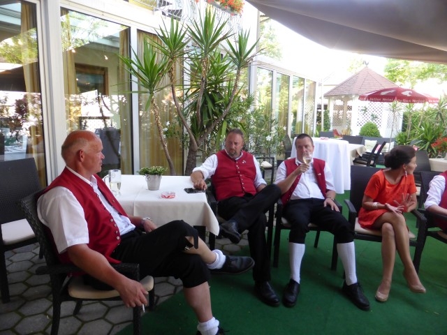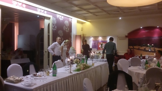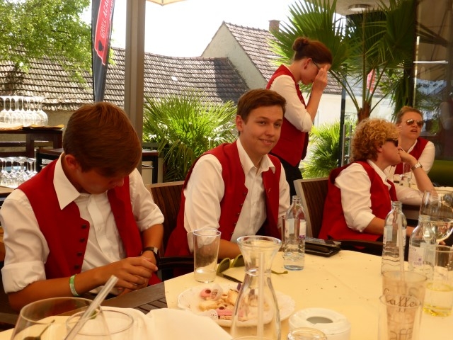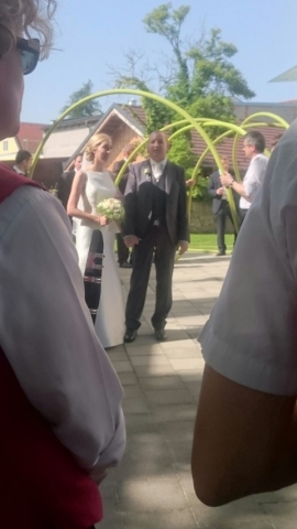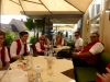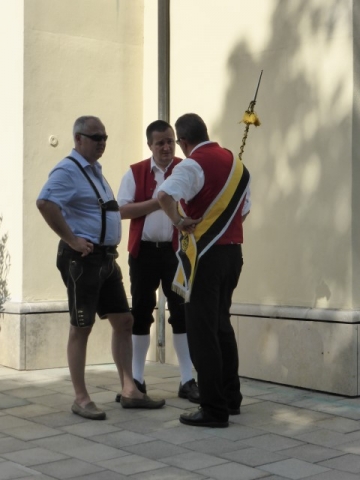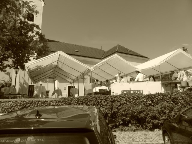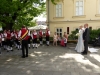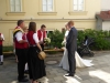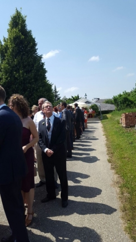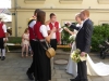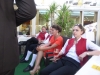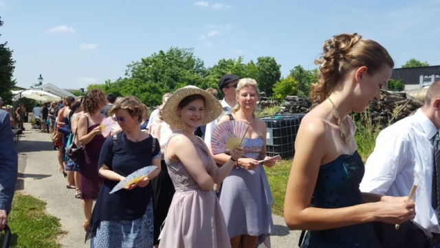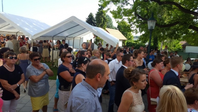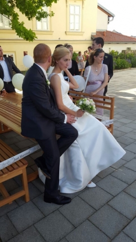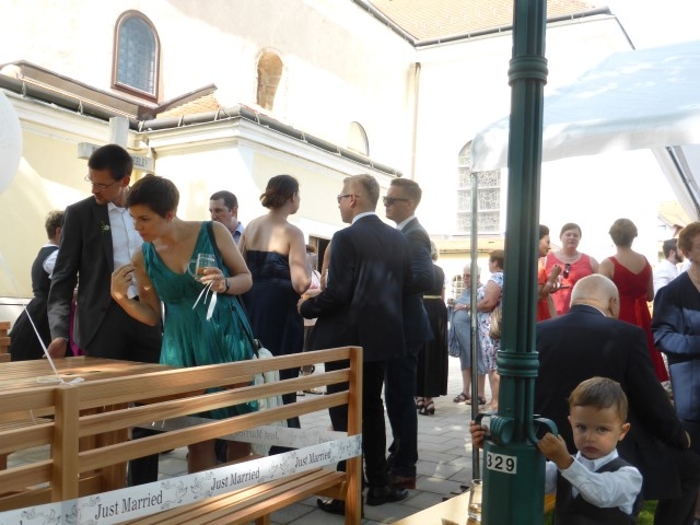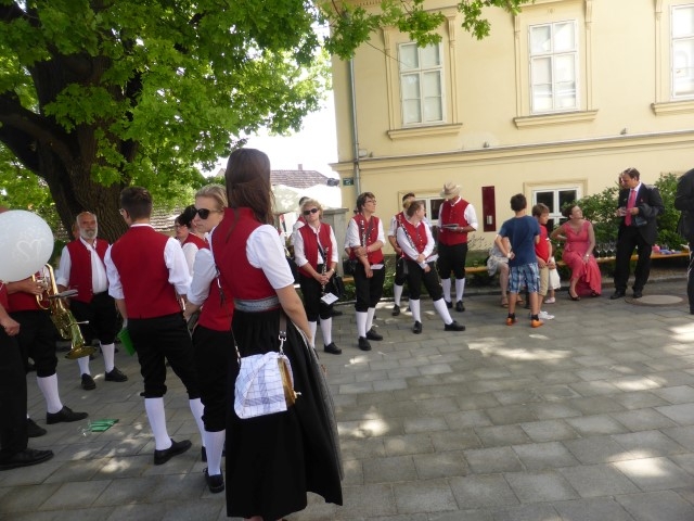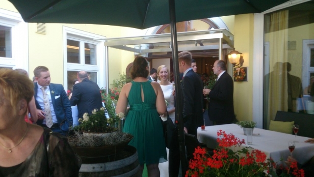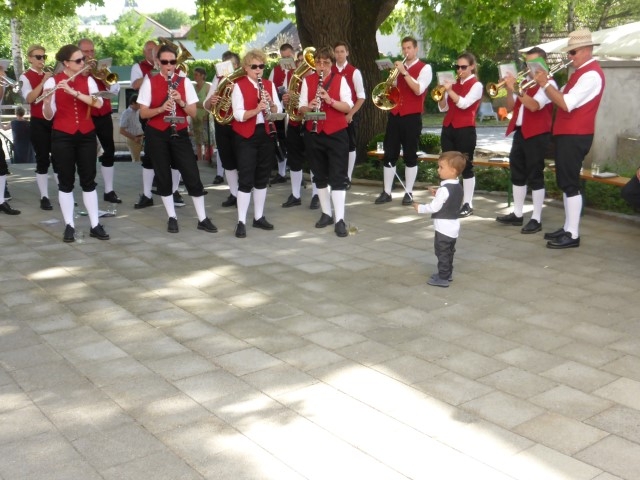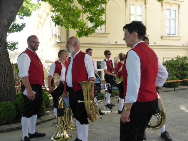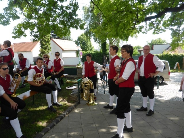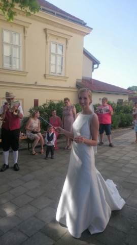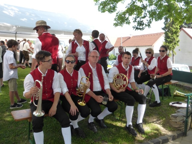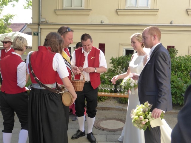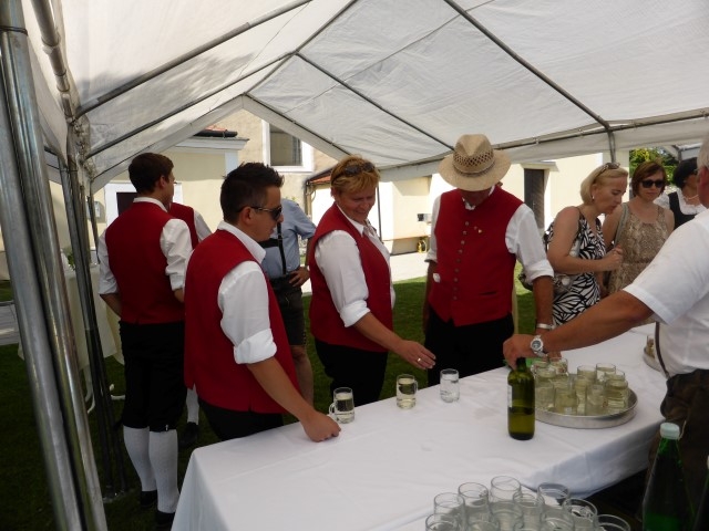 Gegen 13:30 Uhr marschierte die Jugendblasmusik in klingendem Spiel zum Elternhaus von Johannes, wo sich bereits die geladenen Gäste, sowie der Bräutigam versammelt hatten. Dort suchten wir uns erstmal ein schattiges Plätzchen, um der glühenden Hitze zumindest für ein paar Minuten zu entfliehen. Nachdem wir die Hochzeitsgesellschaft mit ein paar Stücken unterhielten, stellten wir uns wieder in Marschformation auf, um den Hochzeitszug in die Kirche anzuführen. Um 14:30 fand die Trauung in der Pfarrkirche Göttlesbrunn statt. Nach der Messe wurde auf dem Kirchenplatz zu einer Agape geladen, welche von den MusikerInnen musikalisch umrahmt wurde. Um zirka 17:30 Uhr machten sich Alle auf den Weg nach Gallbrunn in den Landgasthof Muhr, wo zur Hochzeitstafel geladen wurde. Dort nahm die Jugendblasmusik das frischgetraute Brautpaar musikalisch in Empfang, bevor man zum Essen im festlich geschmückten Saal Platz nahm. Für gute Stimmung bis in die frühen Morgenstunden sorgte die Band "Fortissimo".