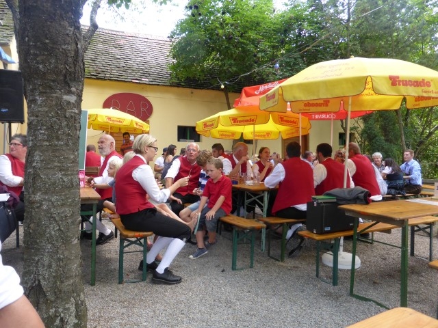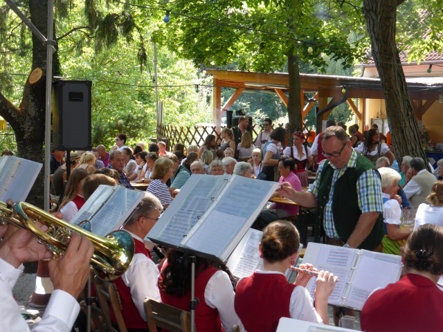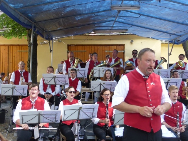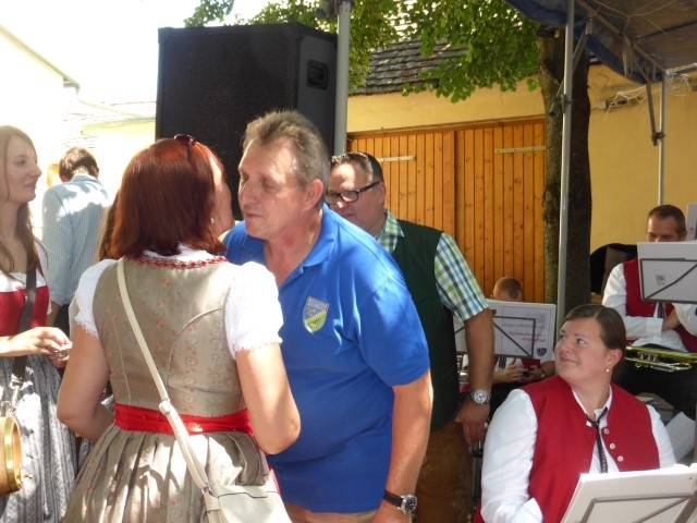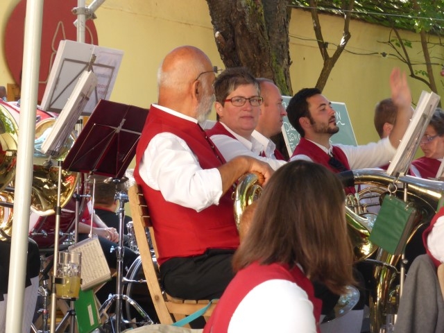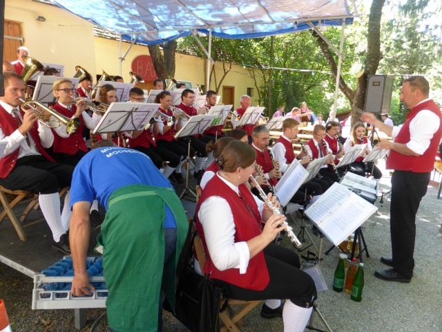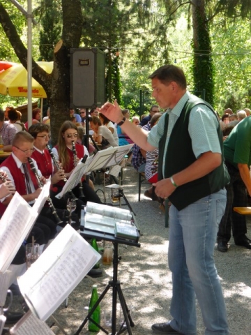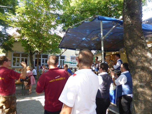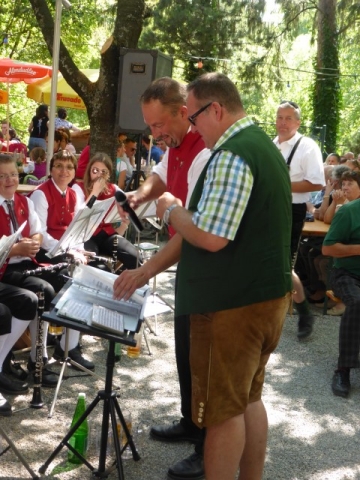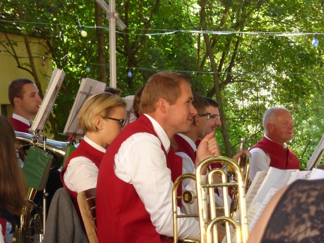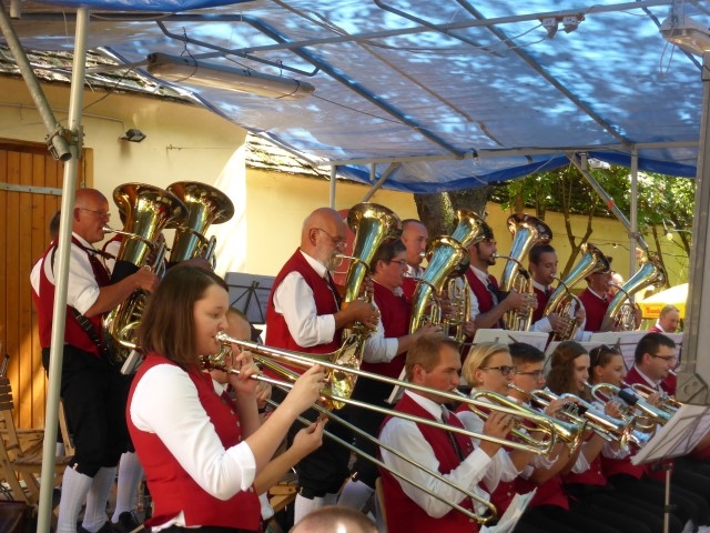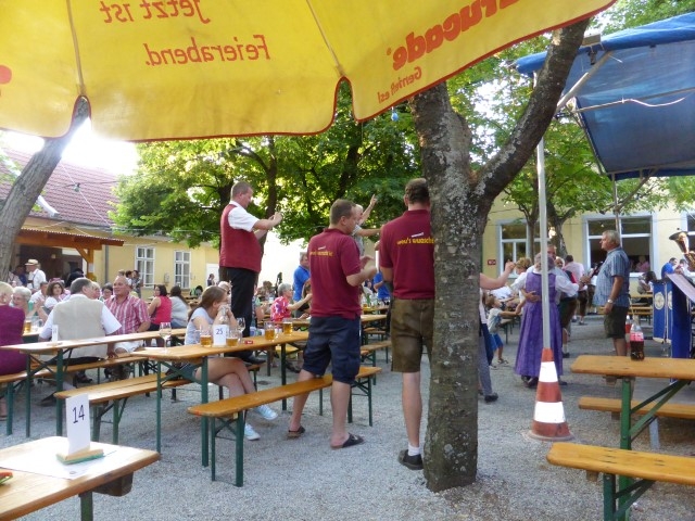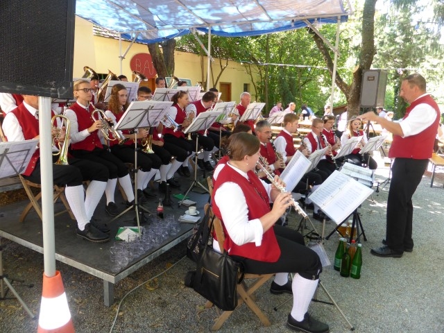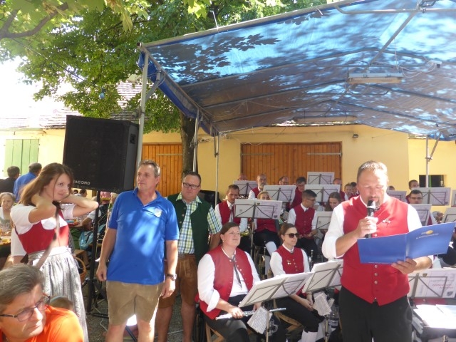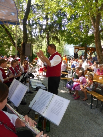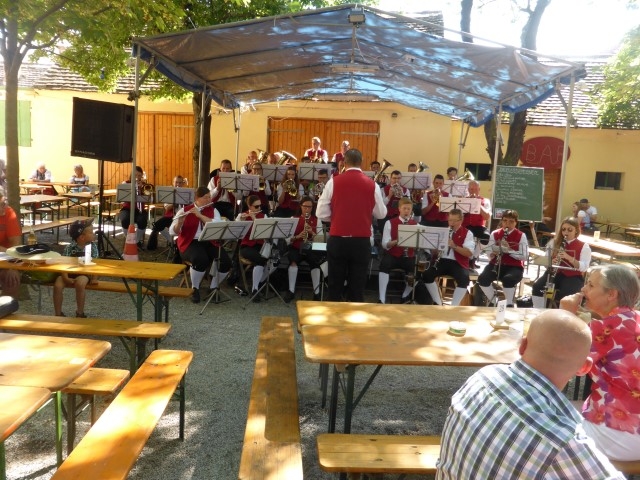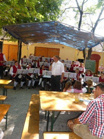 Um 10.30 Uhr begann das musikalische Programm. Trotz der noch etwas frühen Tageszeit herrschte sehr gute Stimmung im Pfarrgarten und die zahlreich erschienenen Gäste unterhielten sich prächtig zu unserer musikalischen Vorstellung. Zwischendurch wurde von unserem Kapellmeister, Landesobmann-Stellvertreter und Bezirksobmann Bernhard Fischer eine Auszeichnung verliehen. Martina Kitzweger bekam das Silberne Marketenderinnen-Abzeichen für ihre langjährige Tätigkeit im Moosbrunner Musikverein überreicht. Danach ging es natürlich mit unserer musikalischen Darbietung weiter. Das Essen und Trinken auf den Tischen der Gäste musste warten, denn zu den Stücken "Der Böhmische Traum", "Dem Land Tirol die Treue" und "Hei Gänschen Hei" ließ es sich keiner nehmen, aufzustehen und fleißig mitzuklatschen. Diese ausgelassene Stimmung herrschte natürliche auch bei der Vorführung der Stallberg Musikanten, die um zirka 15 Uhr in das Abendprogramm starteten. Diese verlängerten sogar ihre geplante Spielzeit um 1 1/2 Stunden und spielten bis zirka 20.30 Uhr ein ausgezeichnetes Programm. Mittlerweile waren die meisten unserer Musikanten schon nach Hause gefahren und nur noch ein kleiner Teil der Jugendblasmusik war vertreten. Doch ans Nach-Hause-Gehen wurde nicht gedacht. Denn jetzt war es an der Zeit, dass alle anwesenden MusikerInnen ihr Instrument zur Hand nehmen konnten, um gemeinsam den Abend mit gemütlichen Musikstücken ausklingen zu lassen. Fazit des Tages: Es war ein sehr schöner und lustiger Tag in Moosbrunn. Wir kommen wieder! |