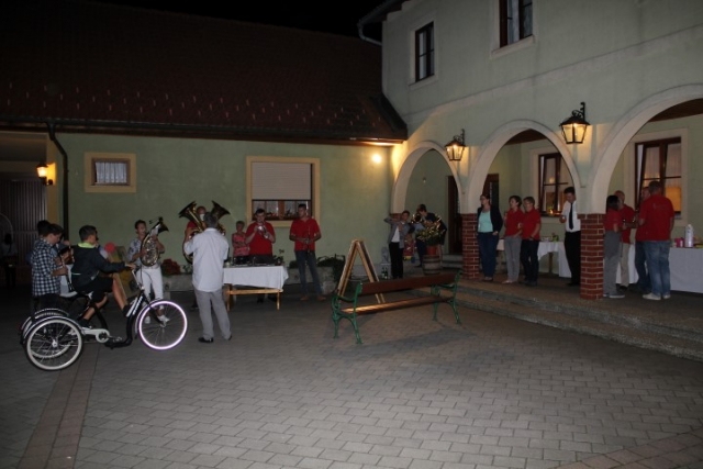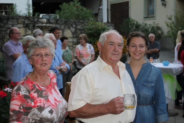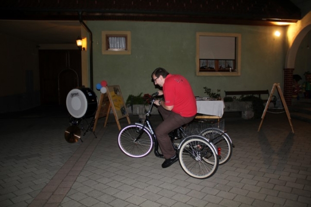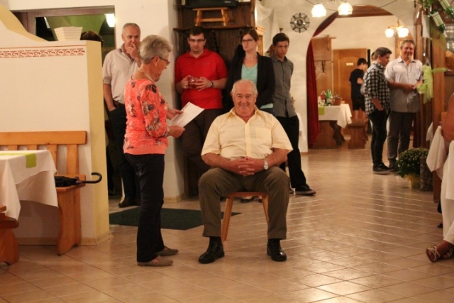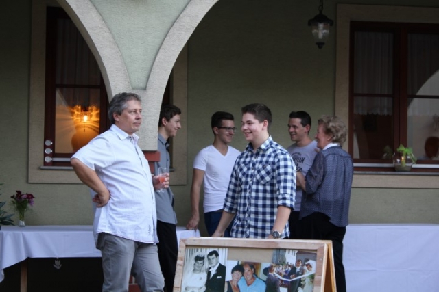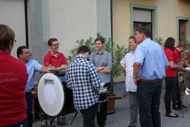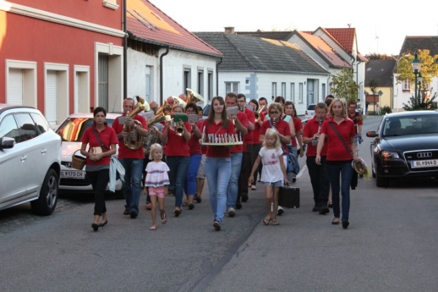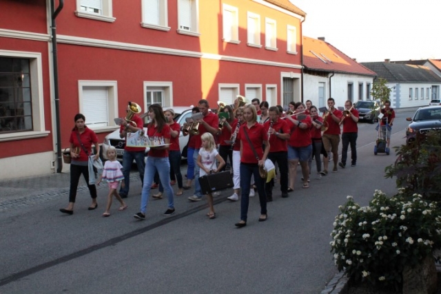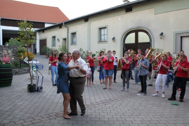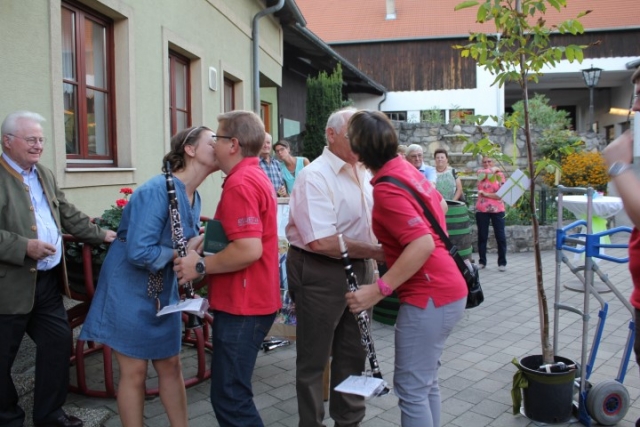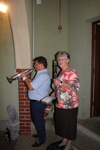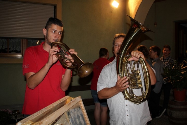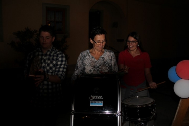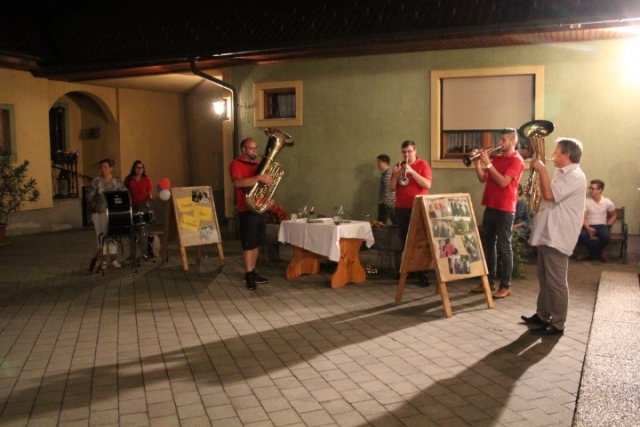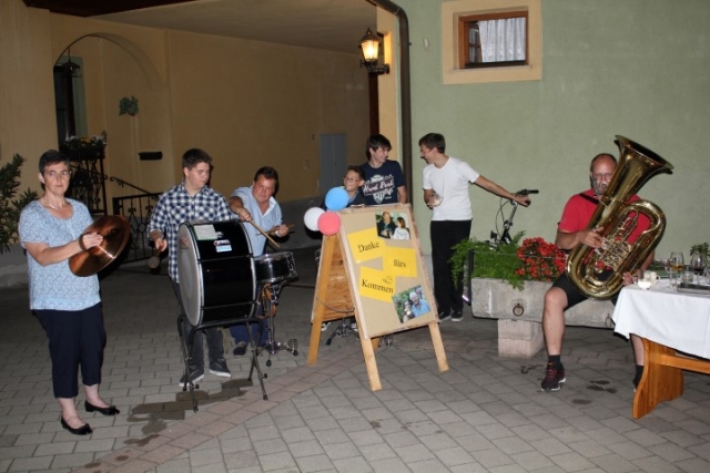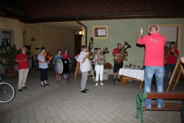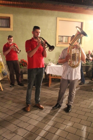 Um zirka 18.15 Uhr marschierte die Jugendblasmusik in klingendem Spiel in den Hof der Familie Paul ein und spielte dort den beiden Geburtstagskindern ein kleines Ständchen. Von Obmann Thomas Flamm und den Marketenderinnen wurden danach die Geschenke überreicht, welche für große Freude und ein leichtes Schmunzeln in den Gesichtern sorgten. Bekannterweise ist die Jugendblasmusik ein großer Fan von Herrn Pauls selbstgemachtem Nussschnaps. Damit auch für die nächsten Feierlichkeiten der Vorrat gesichert ist, wurde dem Jubilar ein Nussbaum geschenkt. Auch Feuerwehrkommandant Alexander Faust überbrachte Glückwünsche im Namen aller Feuerwehrkameraden - leider nur mit einer Flasche Wein, da er den Platz des eigentlichen Geschenks nicht ausfindig machen konnte. Die Überreichung wird aber natürlich bald nachgeholt. Nach den etlichen Gratulationen und Glückwünschen war es endlich soweit und der Hunger konnte mit köstlichen Stelzen gestillt werden. Dank des herrlichen Wetters konnte der Großteil der Feier im Freien stattfinden, wo Anton Paul unter anderem das Geschenk seiner Familie überreicht bekam. Wählen kann er zwischen einem Elektrorad, einem Dreirad oder einem Moped. Die Fahrzeuge musste er natürlich gleich auf deren Tauglichkeit testen, was für uns Zuseher ein Riesenspaß war. Wie so oft, wollten auch diesmal einige unserer Musikanten ihr Instrument nicht aus der Hand geben und boten ein lustiges, stimmungsvolles und teilweise chaotisches Musikprogramm. Dazu wurde von den anderen Gästen fleißig getanzt und geklatscht. Die Stimmung war ausgezeichnet und hielt bis in die frühen Morgenstunden an. Es war eine sehr tolle Feier, die uns allen noch lange in Erinnerung bleiben wird. |