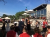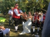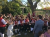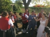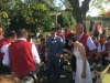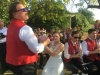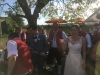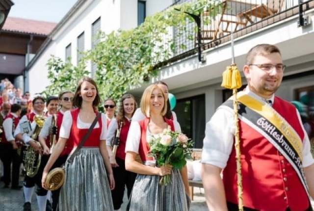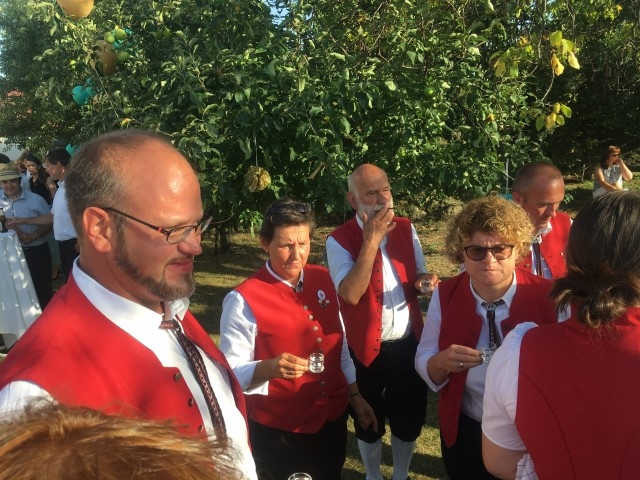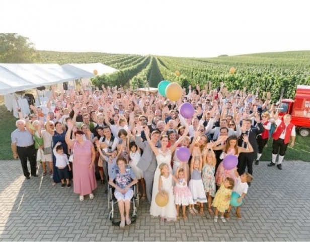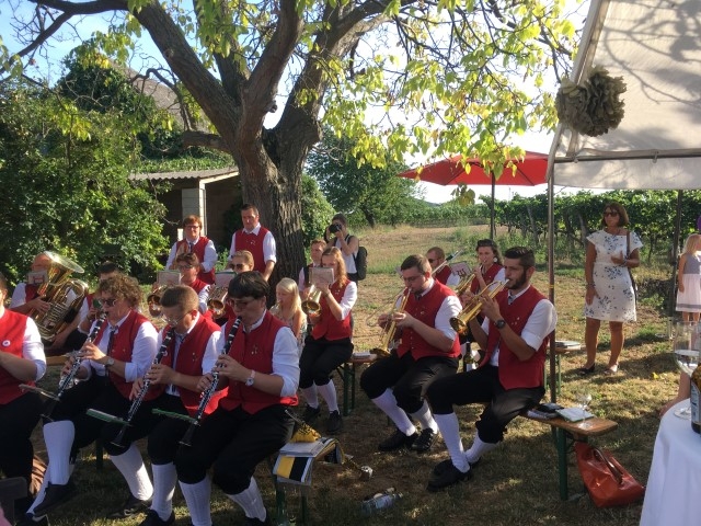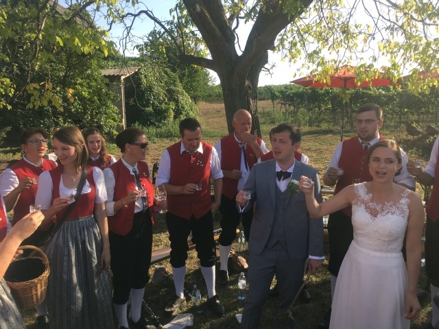 Treffpunkt war um 13.30 Uhr im Weingut Netzl, wo der Bräutigam die eintreffenden Gäste begrüßte. Um ca. 14.45 Uhr bildete sich ein Hochzeitszug, den die Jugendblasmusik bis zur Pfarrkirche in Göttlesbrunn anführte. Nach der gefühlvollen Trauung zog die Hochzeitsgesellschaft wieder zurück ins Weingut Netzl, um dort eine Agape zu feiern. Diese wurde von der Jugendblasmusik musikalisch umrahmt. Bei den brütend heißen Temperaturen wurden jedes noch so kleine Plätzchen im Schatten und einige kühle Spritzer als Abkühlung genutzt.