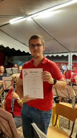 Von 19.30 bis 22.30 Uhr spielten wir einen abwechslungsreichen Dämmerschoppen. Es war der erste Auftritt in diesem Jahr, bei dem wir wieder als gesamte Musikkapelle spielen durften. Daher freute es uns umso mehr, alle Festgäste endlich wieder musikalisch zu unterhalten. Außerdem überreichten wir unserem Jugendorchesterleiter Thomas Krackhofer sein Jungmusikerleistungsabzeichen in Silber auf der Klarinette, welches er mit ausgezeichnetem Erfolg bestanden hat. Wir sind stolz und gratulieren ganz herzlich.