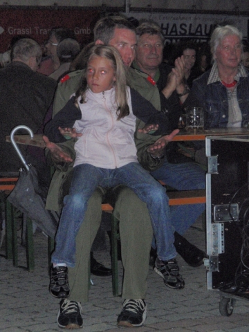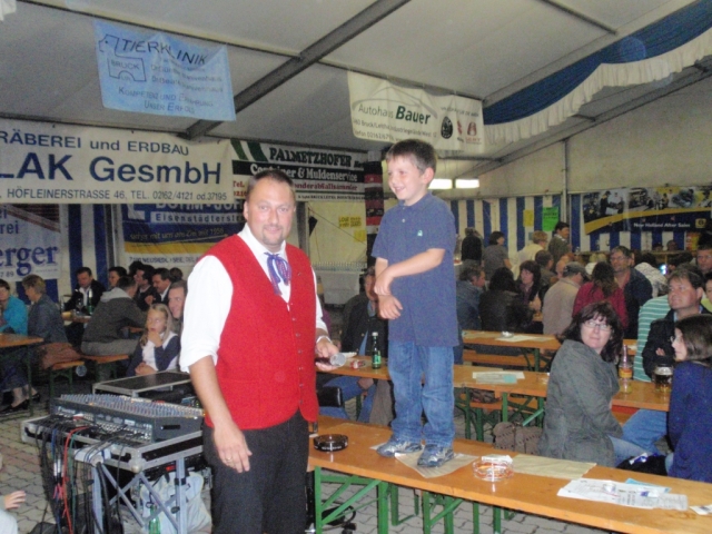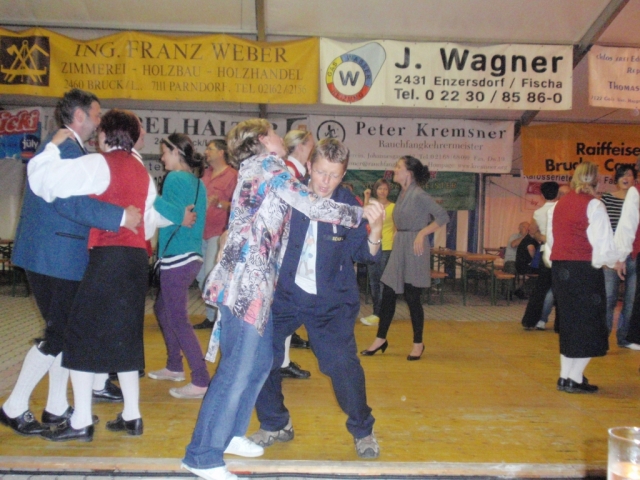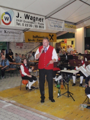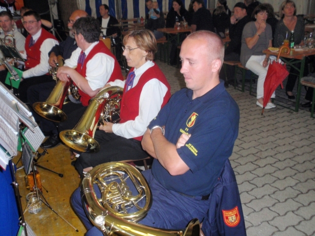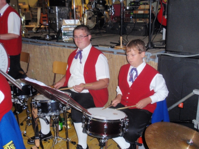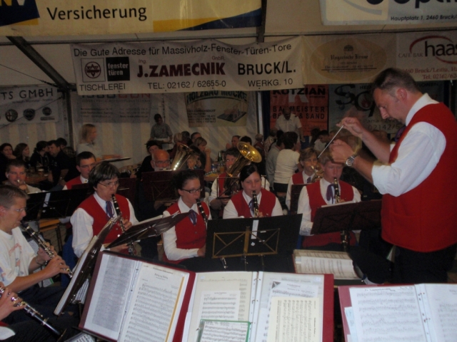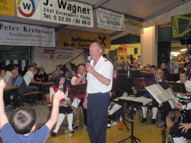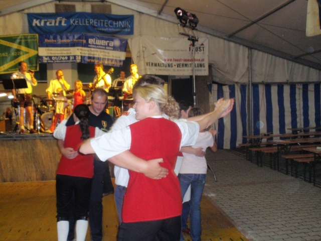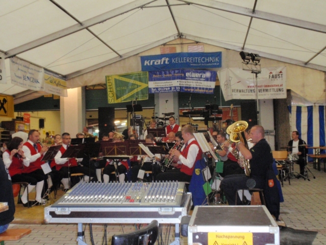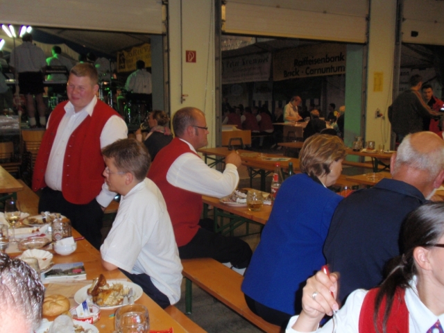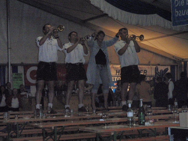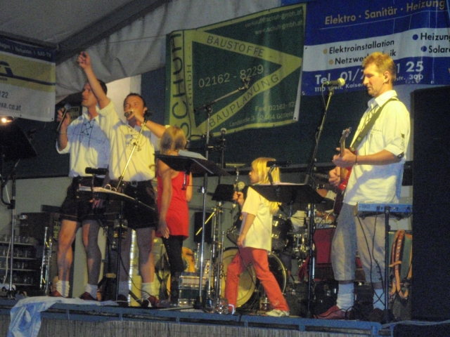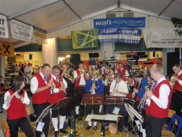 Ab 18.30 Uhr spielten wir ein 2-stündiges Dämmerschoppen, während dessen sich das Festzelt mit zahlreichen Besuchern füllte. Mit Musikstücken wie „Abba Gold“, „Böhmischer Traum“, „Dem Land Tirol die Treue“, usw. wurde hervorragende Stimmung in das Festzelt gebracht. Als weitere Attraktion sang auch unser Kapellmeister Bernhard Fischer mit dem erst 5-jährigen Matthias Schwarz die Polka „Hei, Ihr Gänschen, hei!“ Nach unserer musikalischen Darbietung wurde die Tanzfläche geräumt und für die Musikgruppe „Die Urigen“ Platz gemacht. Diese sorgte bis in die frühen Morgenstunden mit Tanzmusik für ausgezeichnete Unterhaltung im Festzelt, wobei zahlreich auf den Tischen und Bänken getanzt wurde.