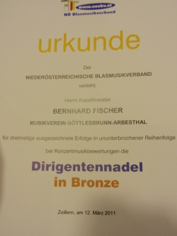 Grund dafür war die Überreichung der „Dirigentennadel in Bronze“ für unseren Kapellmeister Bernhard Fischer. Diese Auszeichnung erhält man nur bei dreimaliger ununterbrochener Teilnahme an den Konzertmusikbewertungen. Wobei nur die Teilnahme nicht genügt, sonder man dreimal hintereinander einen ausgezeichneten Erfolg erzielen muss, was unseren Kapellmeister mit der Jugendblasmusik Göttlesbrunn-Arbesthal gelang.